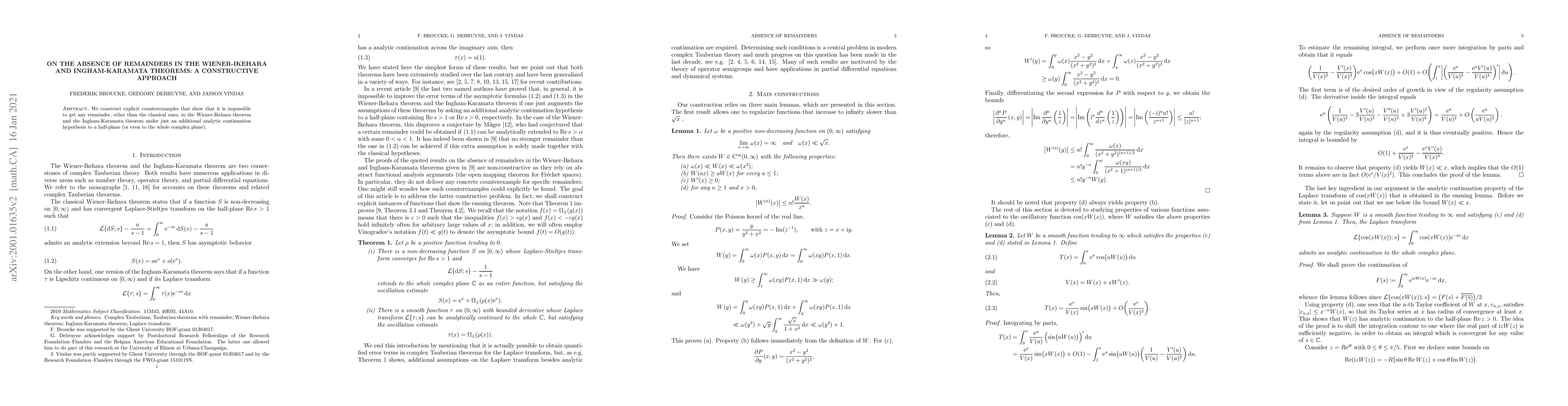 We construct explicit counterexamples that show that it is impossible to get any remainder, other than the classical ones, in the Wiener-Ikehara theorem and the Ingham-Karamata theorem under just an additional analytic continuation hypothesis to a half-plane (or even to the whole complex plane).