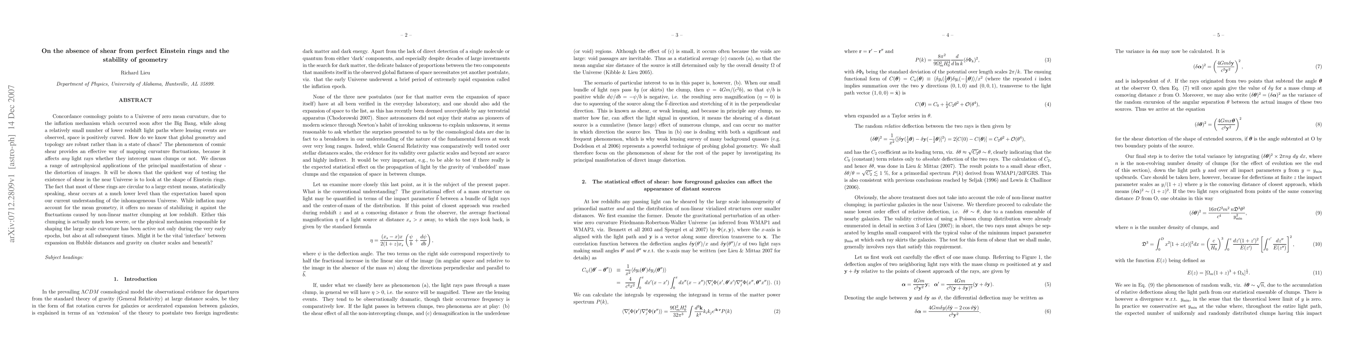 This paper explores the stability of cosmic geometry by investigating the absence of shear in perfect Einstein rings, suggesting that the low level of shear observed indicates either less severe matter clumping or a continuous physical mechanism maintaining the large-scale curvature beyond early Universe inflation.