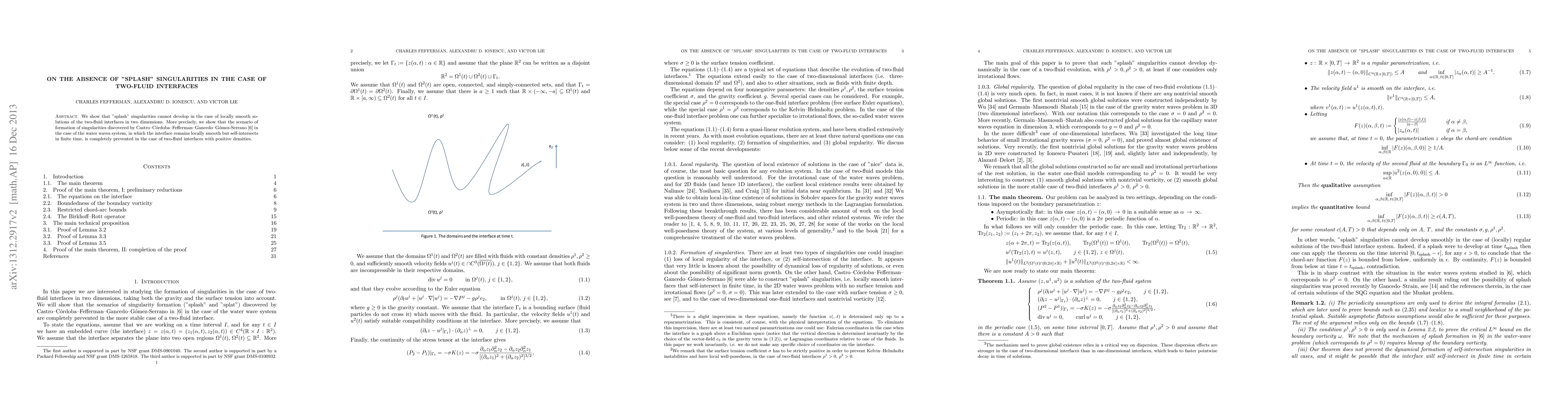 We show that "splash" singularities cannot develop in the case of locally smooth solutions of the two-fluid interface in two dimensions. More precisely, we show that the scenario of formation of singularities discovered by Castro-C\'{o}rdoba-Fefferman-Gancedo-G\'{o}mez-Serrano in the case of the water waves system, in which the interface remains locally smooth but self-intersects in finite time, is completely prevented in the case of two-fluid interfaces with positive densities.
