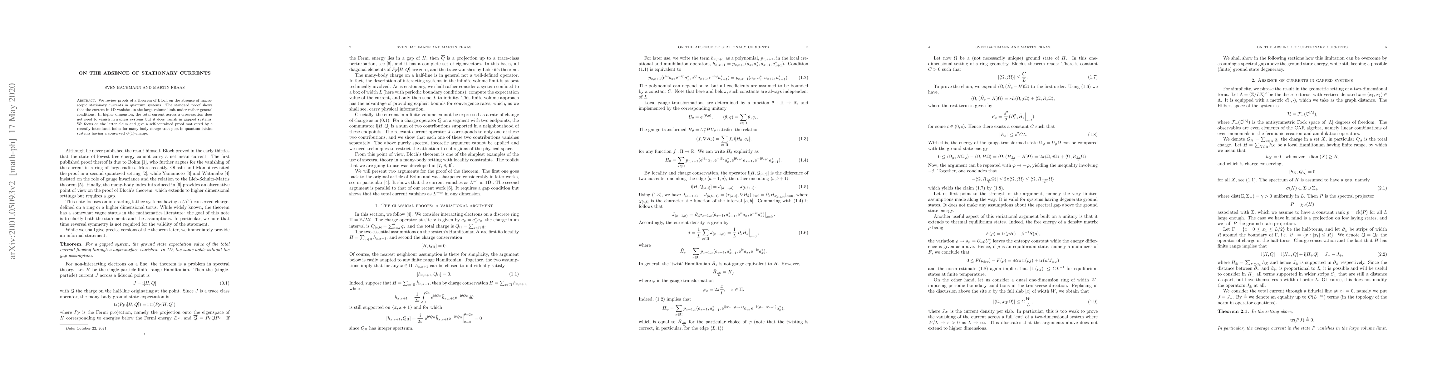 We review proofs of a theorem of Bloch on the absence of macroscopic stationary currents in quantum systems. The standard proof shows that the current in 1D vanishes in the large volume limit under rather general conditions. In higher dimension, the total current across a cross-section does not need to vanish in gapless systems but it does vanish in gapped systems. We focus on the latter claim and give a self-contained proof motivated by a recently introduced index for many-body charge transport in quantum lattice systems having a conserved $U(1)$-charge.