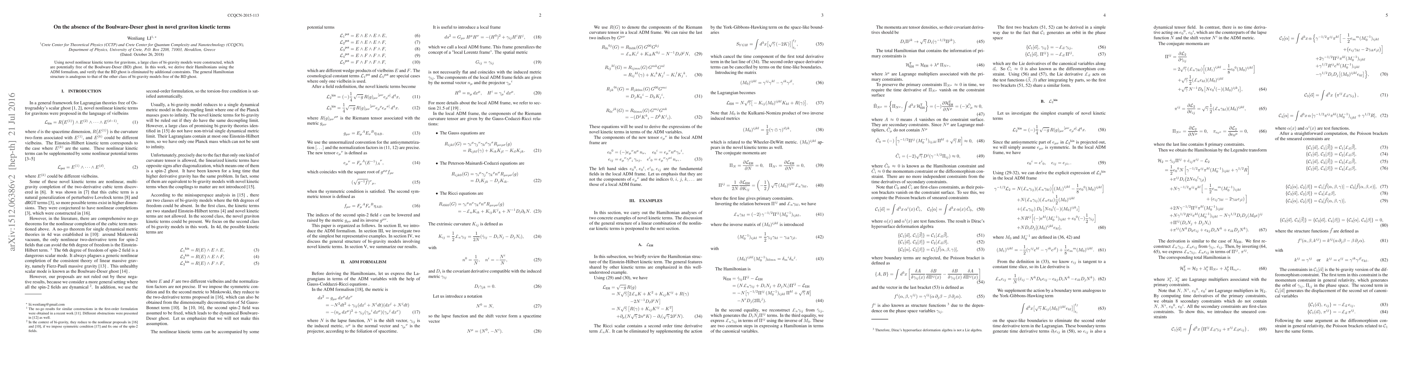 Using novel nonlinear kinetic terms for gravitons, a large class of bi-gravity models were constructed, which are potentially free of the Boulware-Deser (BD) ghost. In this work, we derive their Hamiltonians using the ADM formalism, and verify that the BD ghost is eliminated by additional constraints. The general Hamiltonian structure is analogous to that of the other class of bi-gravity models free of the BD ghost.