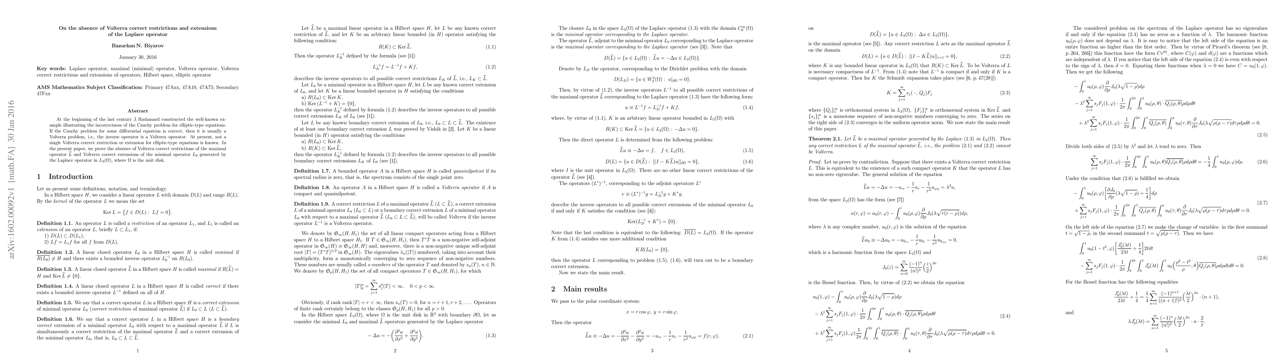 At the beginning of the last century J. Hadamard constructed the well-known example illustrating the incorrectness of the Cauchy problem for elliptic-type equations. If the Cauchy problem for some differential equation is correct, then it is usually a Volterra problem, i.e., the inverse operator is a Volterra operator. At present, not a single Volterra correct restriction or extension for elliptic-type equations is known. In the present paper, we prove the absence of Volterra correct restrictions of the maximal operator $\widehat{L}$ and Volterra correct extensions of the minimal operator $L_0$ generated by the Laplace operator in $L_2(\Omega)$, where $\Omega$ is the unit disk.