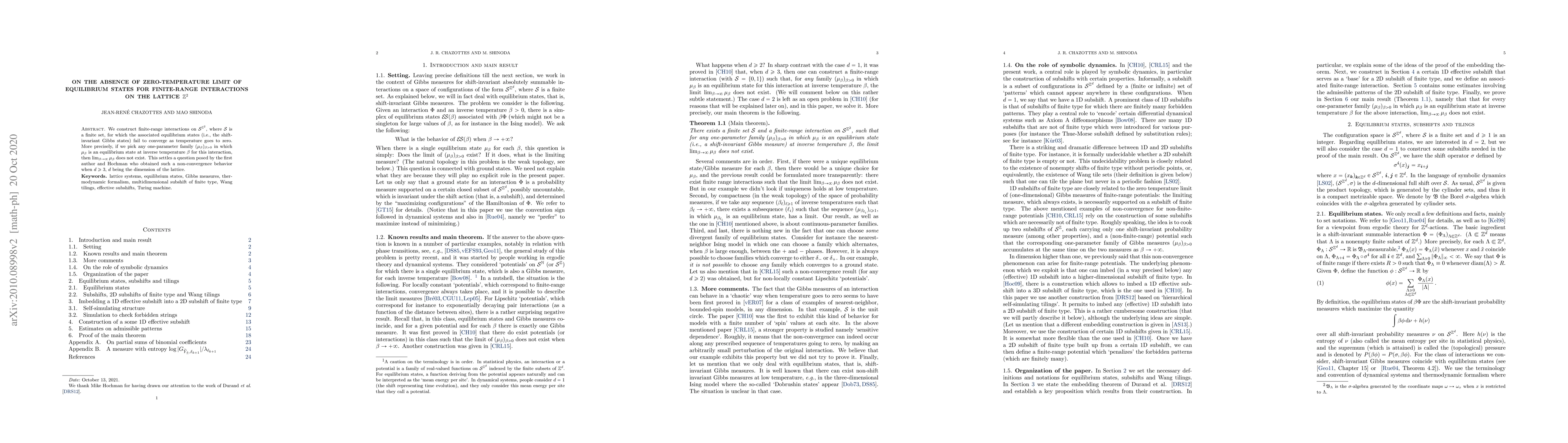 We construct finite-range interactions on $\mathcal{S}^{\mathbb{Z}^2}$, where $\mathcal{S}$ is a finite set, for which the associated equilibrium states (i.e., the shift-invariant Gibbs states) fail to converge as temperature goes to zero. More precisely, if we pick any one-parameter family $(\mu_\beta)_{\beta>0}$ in which $\mu_\beta$ is an equilibrium state at inverse temperature $ \beta$ for this interaction, then $\lim_{\beta\to\infty}\mu_\beta$ does not exist. This settles a question posed by the first author and Hochman who obtained such a non-convergence behavior when $d\geq 3$, $d$ being the dimension of the lattice.
