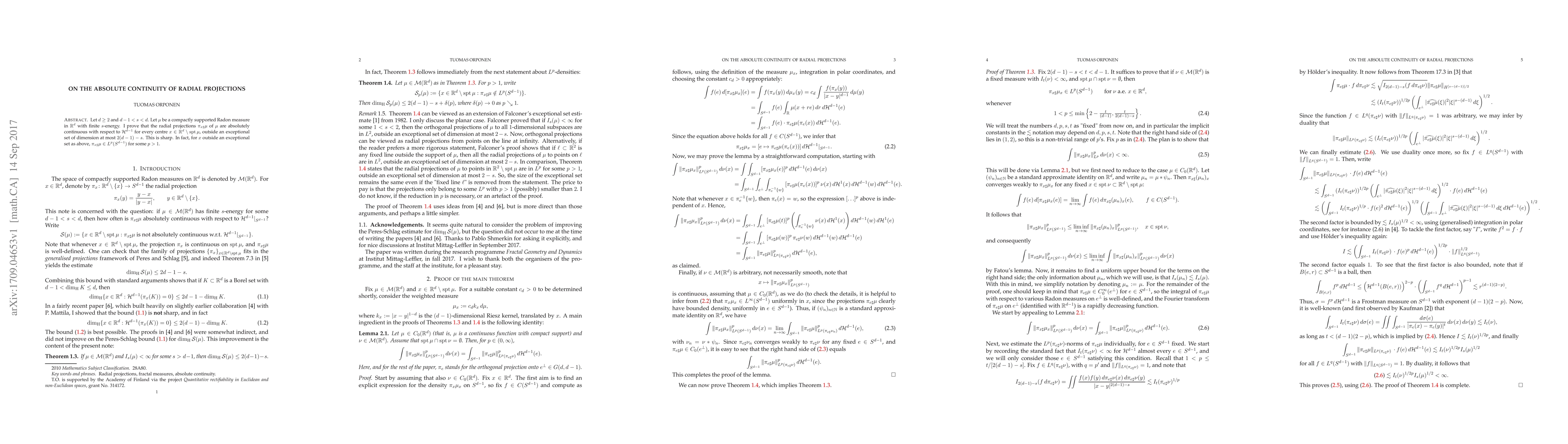 Let $d \geq 2$ and $d - 1 < s < d$. Let $\mu$ be a compactly supported Radon measure in $\mathbb{R}^{d}$ with finite $s$-energy. I prove that the radial projections $\pi_{x\sharp}\mu$ of $\mu$ are absolutely continuous with respect to $\mathcal{H}^{d - 1}$ for every centre $x \in \mathbb{R}^{d} \setminus \operatorname{spt} \mu$, outside an exceptional set of dimension at most $2(d - 1) - s$. This is sharp. In fact, for $x$ outside an exceptional set as above, $\pi_{x\sharp}\mu \in L^{p}(S^{d - 1})$ for some $p > 1$.