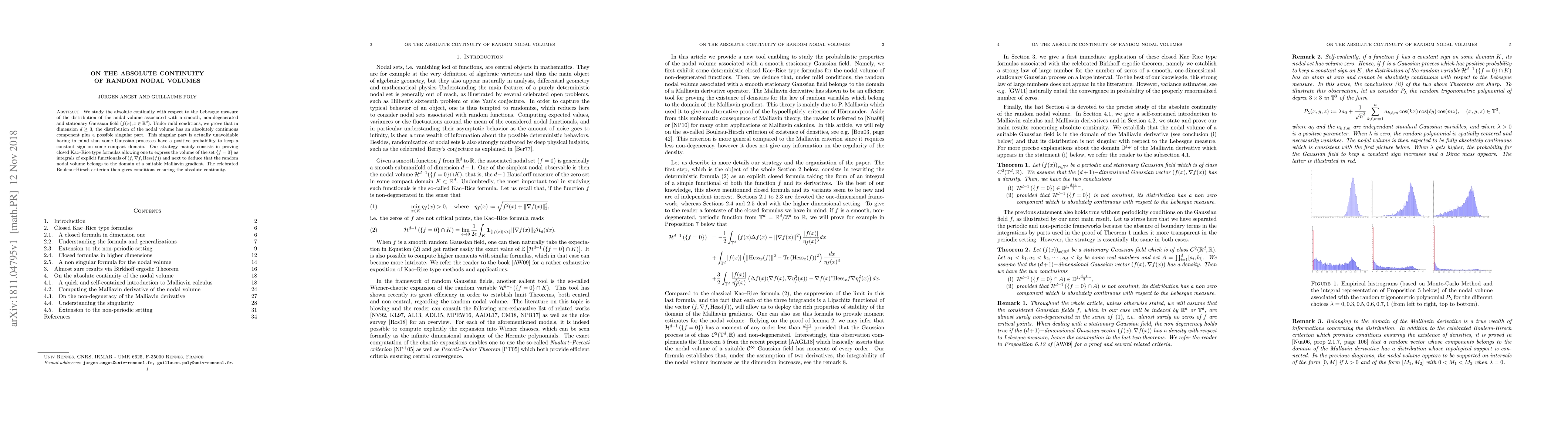 This paper investigates the absolute continuity of the nodal volume distribution in Gaussian fields, proving that in dimensions $d \geq 3$, it comprises an absolutely continuous part plus a singular part, with the latter being inevitable due to the potential constant sign of some Gaussian processes. The authors utilize closed Kac-Rice formulas and the Bouleau-Hirsch criterion to establish these results.