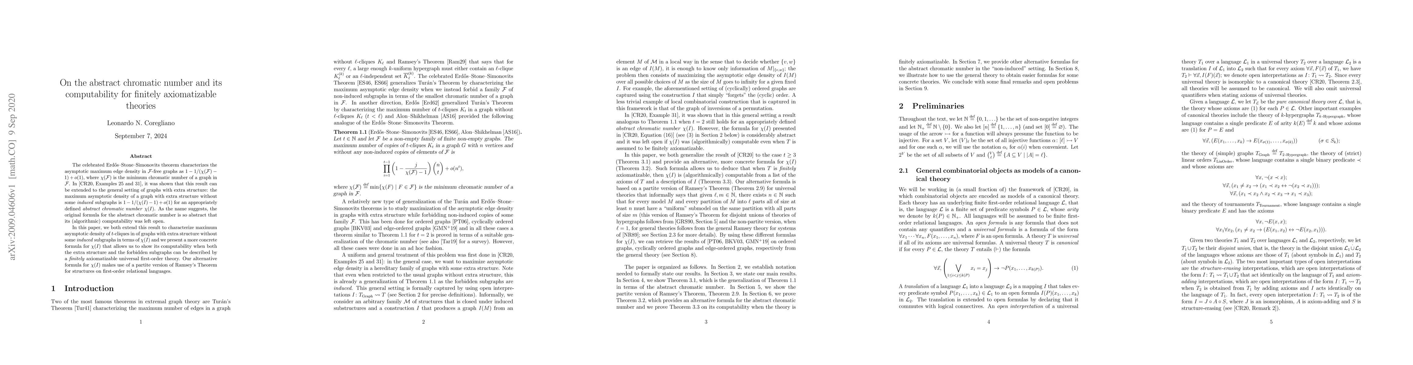The celebrated Erd\H{o}s--Stone--Simonovits theorem characterizes the asymptotic maximum edge density in $\mathcal{F}$-free graphs as $1 - 1/(\chi(\mathcal{F})-1) + o(1)$, where $\chi(\mathcal{F})$ is the minimum chromatic number of a graph in $\mathcal{F}$. In Examples 25 and 31 of [L. N. Coregliano and A. A. Razborov. Semantic limits of dense combinatorial objects. Uspekhi Mat. Nauk, 75(4(454)):45-152, 2020], it was shown that this result can be extended to the general setting of graphs with extra structure: the maximum asymptotic density of a graph with extra structure without some induced subgraphs is $1 - 1/(\chi(I) - 1) + o(1)$ for an appropriately defined abstract chromatic number $\chi(I)$. As the name suggests, the original formula for the abstract chromatic number is so abstract that its (algorithmic) computability was left open. In this paper, we both extend this result to characterize maximum asymptotic density of $t$-cliques in of graphs with extra structure without some induced subgraphs in terms of $\chi(I)$ and we present a more concrete formula for $\chi(I)$ that allows us to show its computability when both the extra structure and the forbidden subgraphs can be described by a finitely axiomatizable universal first-order theory. Our alternative formula for $\chi(I)$ makes use of a partite version of Ramsey's Theorem for structures on first-order relational languages.