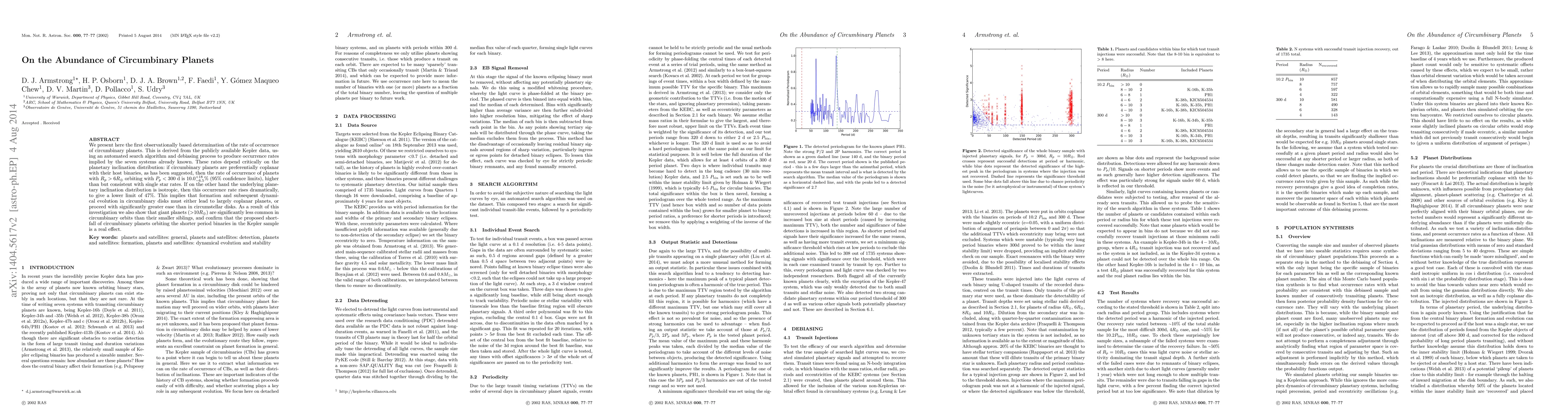 We present here the first observationally based determination of the rate of occurrence of circumbinary planets. This is derived from the publicly available Kepler data, using an automated search algorithm and debiasing process to produce occurrence rates implied by the seven systems already known. These rates depend critically on the planetary inclination distribution: if circumbinary planets are preferentially coplanar with their host binaries, as has been suggested, then the rate of occurrence of planets with $R_p>6R_\oplus$ orbiting with $P_p<300$\ d is $10.0 ^{+18}_{-6.5}$\% (95\% confidence limits), higher than but consistent with single star rates. If on the other hand the underlying planetary inclination distribution is isotropic, then this occurrence rate rises dramatically, to give a lower limit of 47\%. This implies that formation and subsequent dynamical evolution in circumbinary disks must either lead to largely coplanar planets, or proceed with significantly greater ease than in circumstellar disks. As a result of this investigation we also show that giant planets (${>}10R_\oplus$) are significantly less common in circumbinary orbits than their smaller siblings, and confirm that the proposed shortfall of circumbinary planets orbiting the shorter period binaries in the Kepler sample is a real effect.