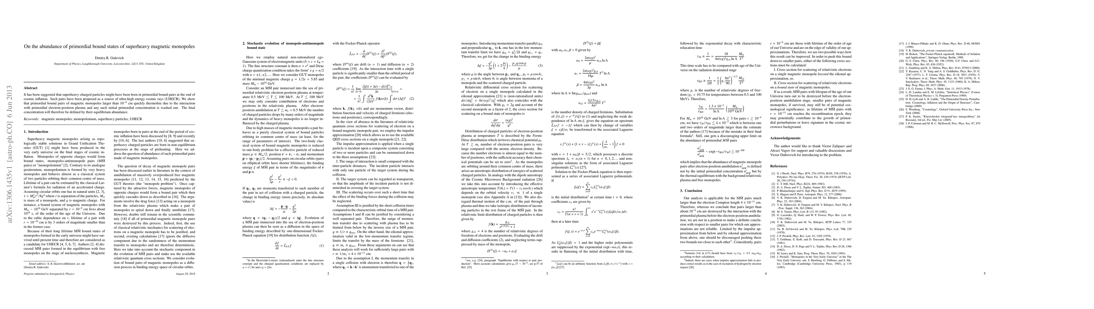 This paper explores the existence of primordial bound states of superheavy magnetic monopoles, suggesting they could be a source of ultra-high energy cosmic rays. It concludes that such monopole pairs larger than $10^{-9}$ cm rapidly thermolyse due to interactions with primordial electron-positron plasma, leading to an equilibrium abundance rather than a primordial concentration.