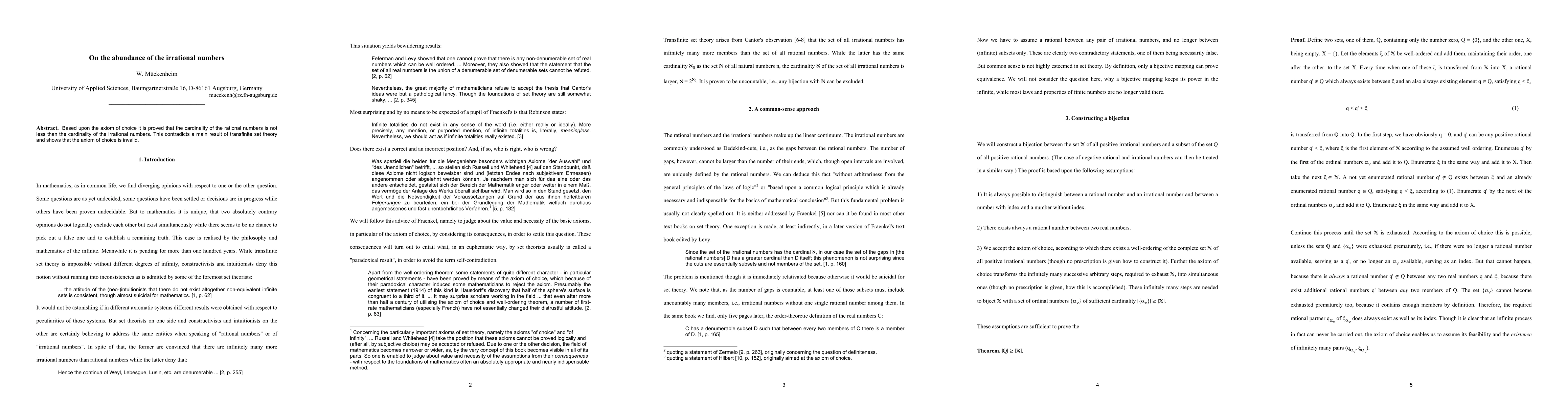Based upon the axiom of choice it is proved that the cardinality of the rational numbers is not less than the cardinality of the irrational numbers. This contradicts a main result of transfinite set theory and shows that the axiom of choice is invalid.