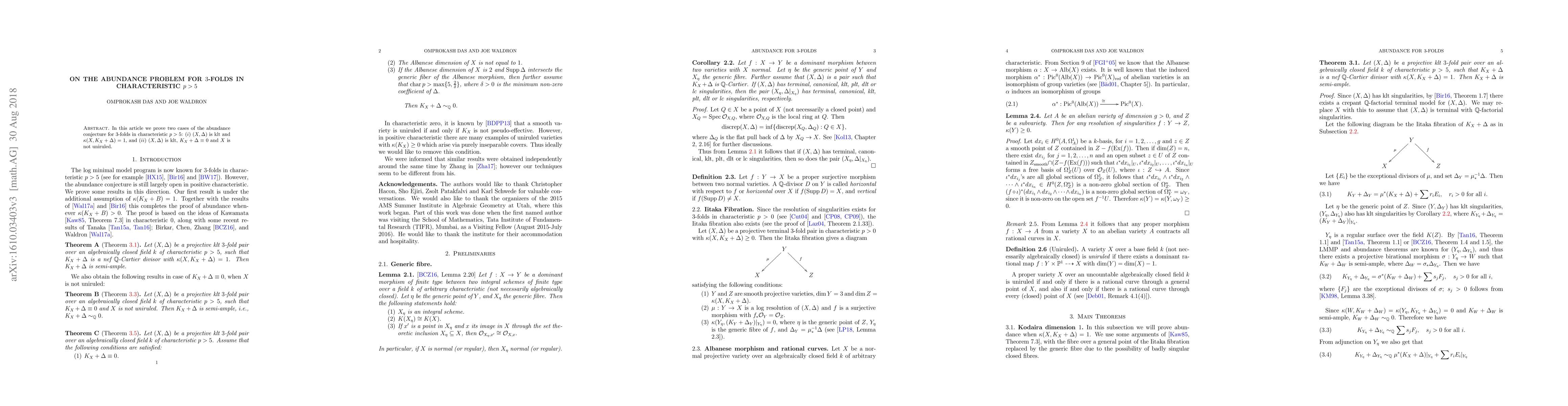 This paper proves two cases of the abundance conjecture for $3$-folds in characteristic $p>5$: when $(X, \Delta)$ is KLT with $\kappa(X, K_X+\Delta)=1$, and when $(X, 0)$ is KLT with $K_X\equiv 0$ and $X$ not uniruled.