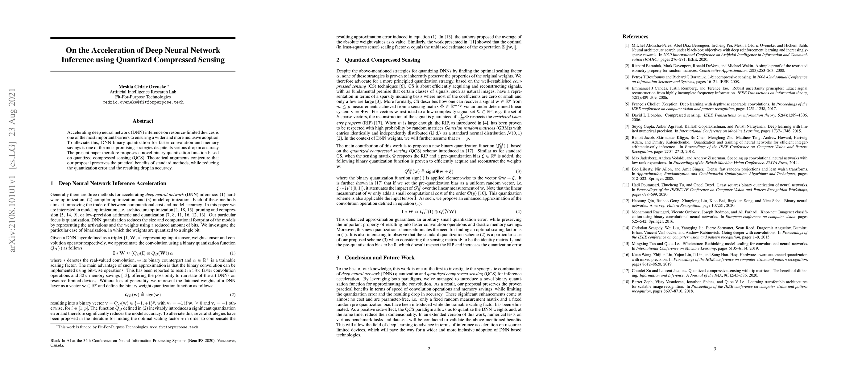 This paper proposes a novel binary quantization function based on quantized compressed sensing (QCS) to accelerate deep neural network (DNN) inference on resource-limited devices, aiming to reduce quantization error and mitigate the accuracy drop typically associated with binary quantization. The theoretical framework suggests that this approach maintains the benefits of standard methods while enhancing performance.