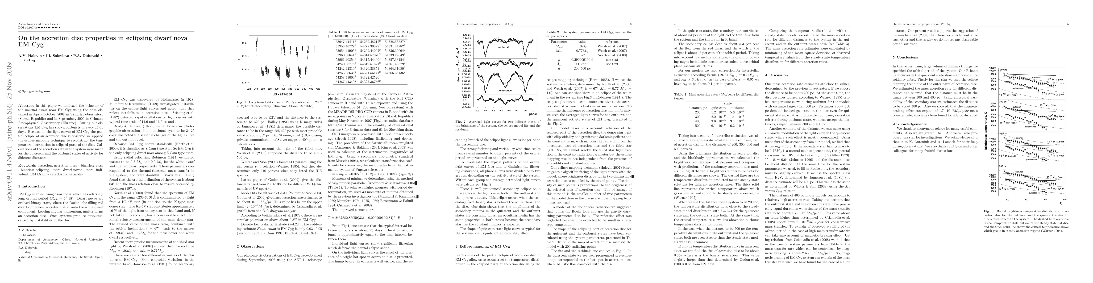 This paper analyzes the accretion disc properties of the dwarf nova EM Cyg, observing its periodic outbursts and applying eclipse mapping to reconstruct the temperature distribution during partial eclipses. Calculations of accretion rates are performed for both quiescent and outburst states across various distances.