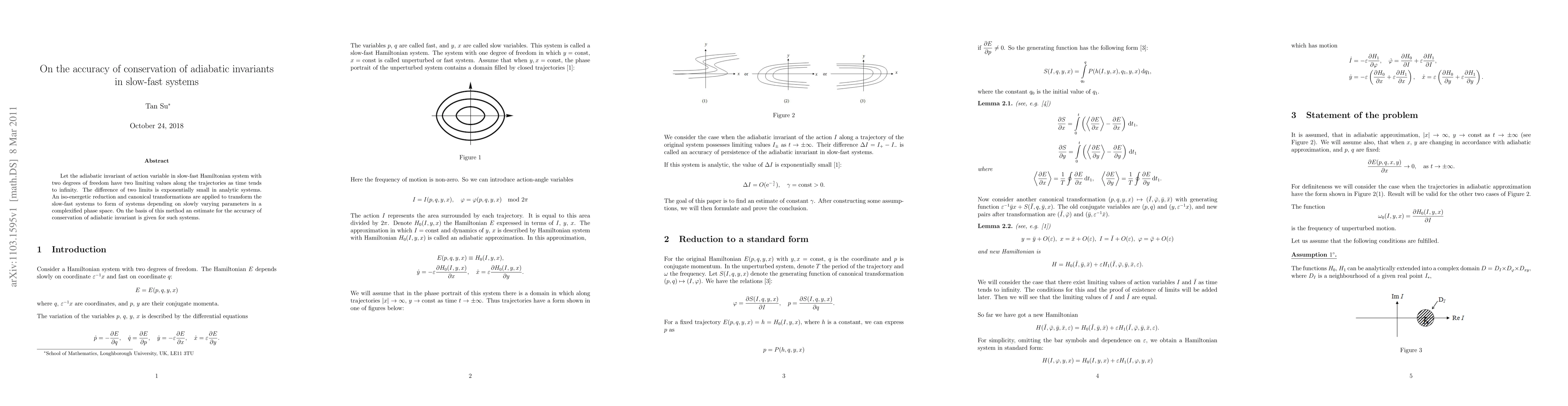 This paper investigates the accuracy of conservation of adiabatic invariants in slow-fast Hamiltonian systems with two degrees of freedom, showing that the difference between two limiting values of the adiabatic invariant tends to be exponentially small. The study employs iso-energetic reduction and canonical transformations to analyze the systems and provides an estimate for the conservation accuracy.