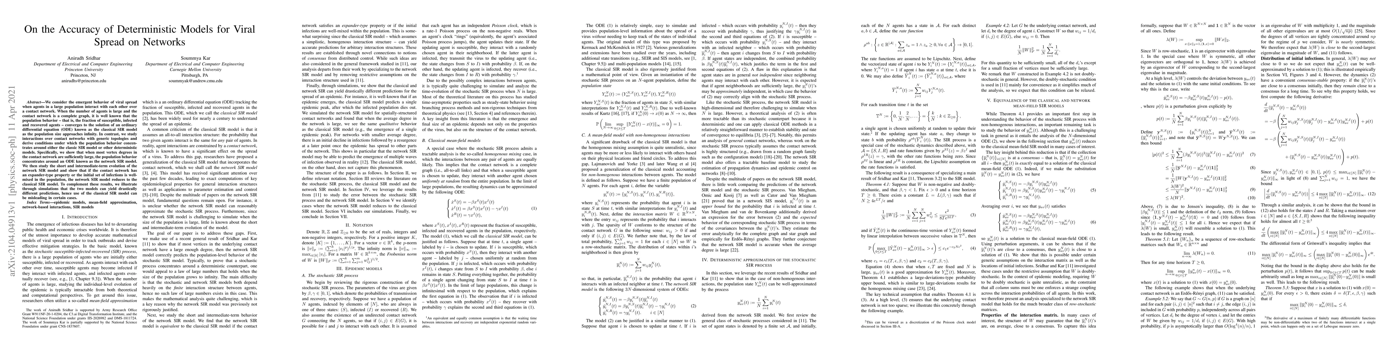 We consider the emergent behavior of viral spread when agents in a large population interact with each other over a contact network. When the number of agents is large and the contact network is a complete graph, it is well known that the population behavior -- that is, the fraction of susceptible, infected and recovered agents -- converges to the solution of an ordinary differential equation (ODE) known as the classical SIR model as the population size approaches infinity. In contrast, we study interactions over contact networks with generic topologies and derive conditions under which the population behavior concentrates around either the classic SIR model or other deterministic models. Specifically, we show that when most vertex degrees in the contact network are sufficiently large, the population behavior concentrates around an ODE known as the network SIR model. We then study the short and intermediate-term evolution of the network SIR model and show that if the contact network has an expander-type property or the initial set of infections is well-mixed in the population, the network SIR model reduces to the classical SIR model. To complement these results, we illustrate through simulations that the two models can yield drastically different predictions, hence use of the classical SIR model can be misleading in certain cases.