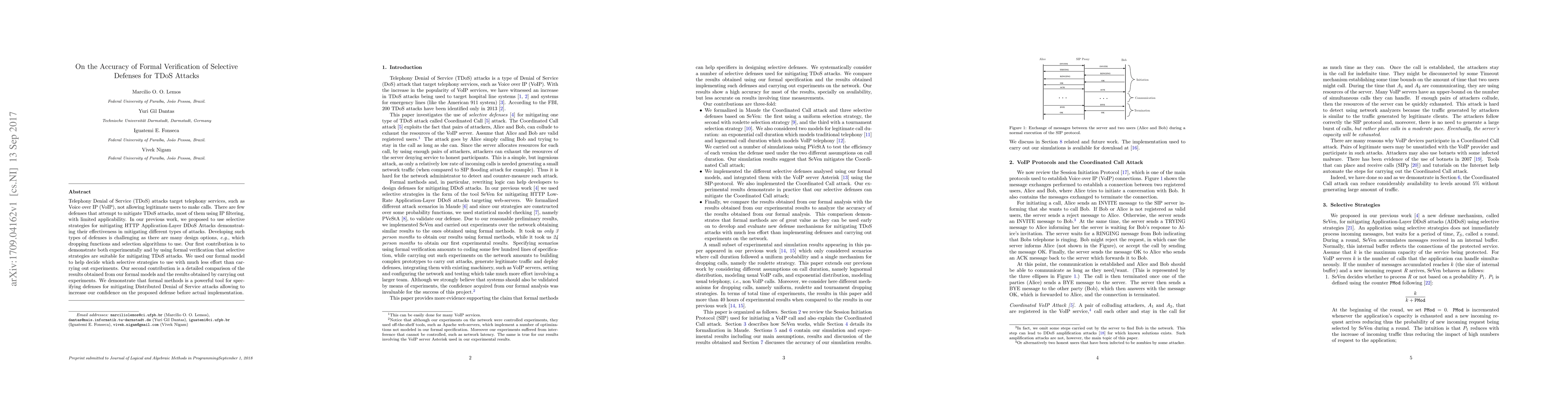 This paper demonstrates through experimental and formal verification that selective strategies are effective for mitigating Telephony Denial of Service (TDoS) attacks. The authors show that formal methods can reliably specify defenses against DDoS, enhancing confidence in proposed defenses before implementation.