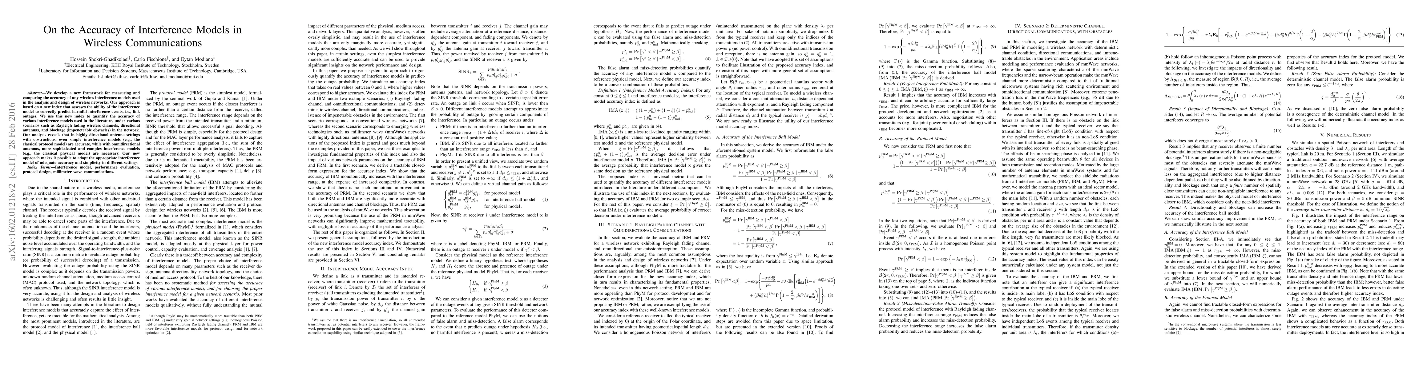 We develop a new framework for measuring and comparing the accuracy of any wireless interference models used in the analysis and design of wireless networks. Our approach is based on a new index that assesses the ability of the interference model to correctly predict harmful interference events, i.e., link outages. We use this new index to quantify the accuracy of various interference models used in the literature, under various scenarios such as Rayleigh fading wireless channels, directional antennas, and blockage (impenetrable obstacles) in the network. Our analysis reveals that in highly directional antenna settings with obstructions, even simple interference models (e.g., the classical protocol model) are accurate, while with omnidirectional antennas, more sophisticated and complex interference models (e.g., the classical physical model) are necessary. Our new approach makes it possible to adopt the appropriate interference model of adequate accuracy and simplicity in different settings.
