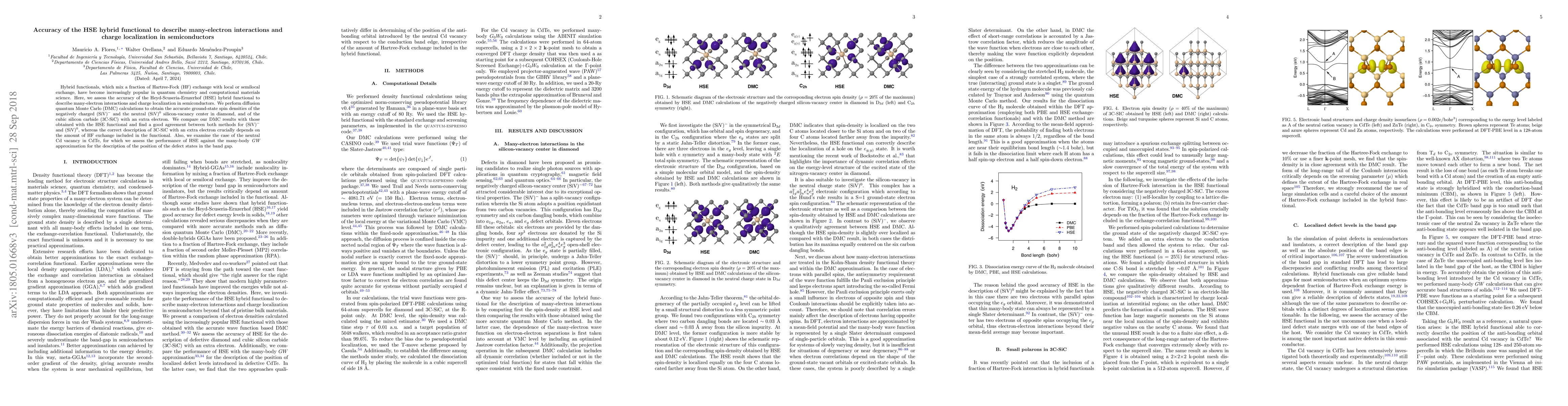 This paper evaluates the accuracy of the HSE hybrid functional in describing many-electron interactions and charge localization in semiconductors, comparing it against diffusion quantum Monte Carlo calculations for specific defects. The HSE functional shows good agreement with DMC for silicon-vacancy centers but requires careful tuning for cubic silicon carbide and Cd vacancy in CdTe.