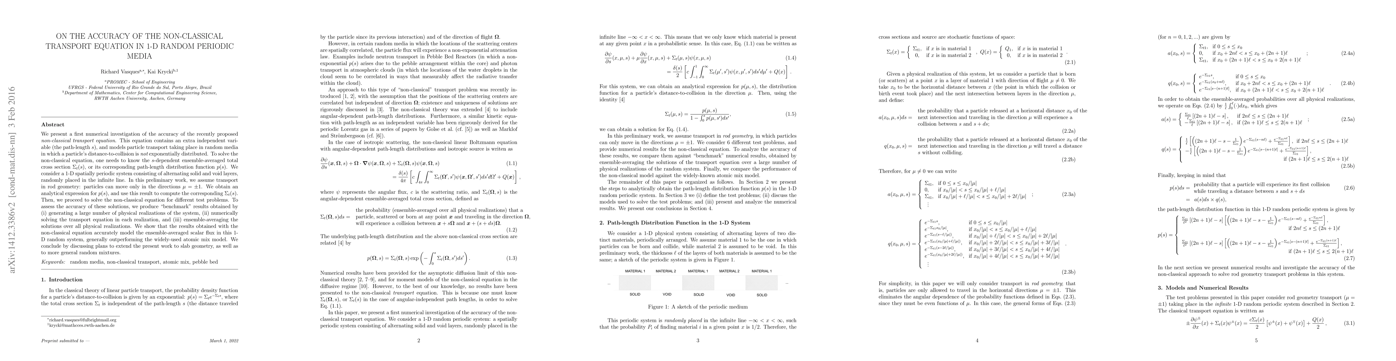 We present a first numerical investigation of the accuracy of the recently proposed {\em non-classical transport equation}. This equation contains an extra independent variable (the path-length $s$), and models particle transport taking place in random media in which a particle's distance-to-collision is {\em not} exponentially distributed. To solve the non-classical equation, one needs to know the $s$-dependent ensemble-averaged total cross section $\Sigma_t(s)$, or its corresponding path-length distribution function $p(s)$. We consider a 1-D spatially periodic system consisting of alternating solid and void layers, randomly placed in the infinite line. In this preliminary work, we assume transport in rod geometry: particles can move only in the directions $\mu=\pm 1$. We obtain an analytical expression for $p(s)$, and use this result to compute the corresponding $\Sigma_t(s)$. Then, we proceed to solve the non-classical equation for different test problems. To assess the accuracy of these solutions, we produce "benchmark" results obtained by (i) generating a large number of physical realizations of the system, (ii) numerically solving the transport equation in each realization, and (iii) ensemble-averaging the solutions over all physical realizations. We show that the results obtained with the non-classical equation accurately model the ensemble-averaged scalar flux in this 1-D random system, generally outperforming the widely-used atomic mix model. We conclude by discussing plans to extend the present work to slab geometry, as well as to more general random mixtures.