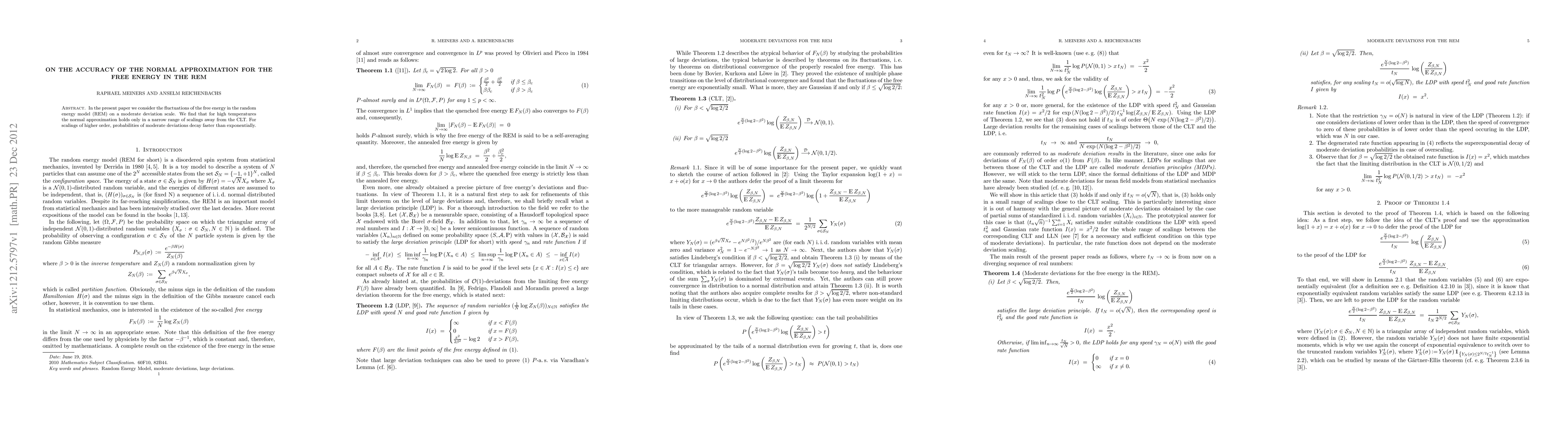 The research examines the random energy model (REM) free energy fluctuations on a moderate deviation scale. It reveals that at high temperatures, the normal approximation for these fluctuations is accurate only for specific, limited scalings, distinct from the Central Limit Theorem. Beyond these, probabilities of moderate deviations decrease more rapidly than exponential.