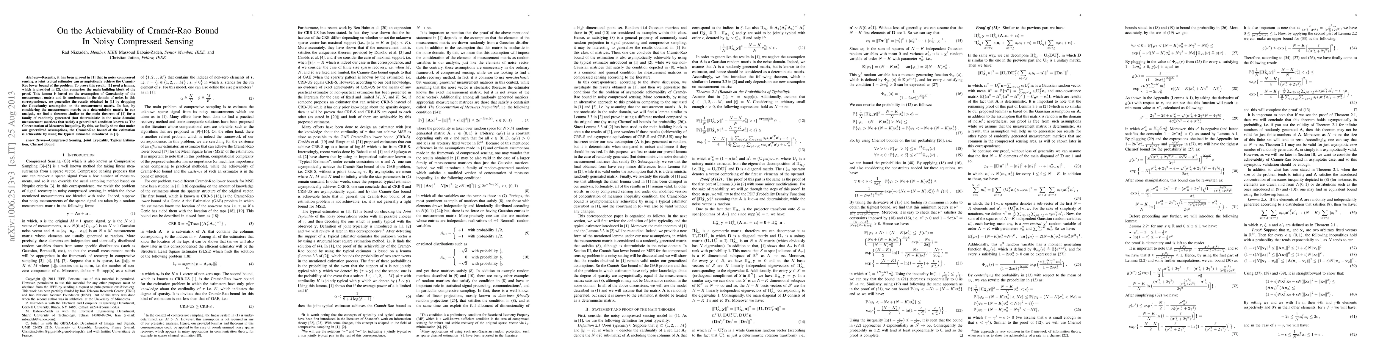 Recently, it has been proved in Babadi et al. that in noisy compressed sensing, a joint typical estimator can asymptotically achieve the Cramer-Rao lower bound of the problem.To prove this result, this paper used a lemma,which is provided in Akcakaya et al,that comprises the main building block of the proof. This lemma is based on the assumption of Gaussianity of the measurement matrix and its randomness in the domain of noise. In this correspondence, we generalize the results obtained in Babadi et al by dropping the Gaussianity assumption on the measurement matrix. In fact, by considering the measurement matrix as a deterministic matrix in our analysis, we find a theorem similar to the main theorem of Babadi et al for a family of randomly generated (but deterministic in the noise domain) measurement matrices that satisfy a generalized condition known as The Concentration of Measures Inequality. By this, we finally show that under our generalized assumptions, the Cramer-Rao bound of the estimation is achievable by using the typical estimator introduced in Babadi et al.