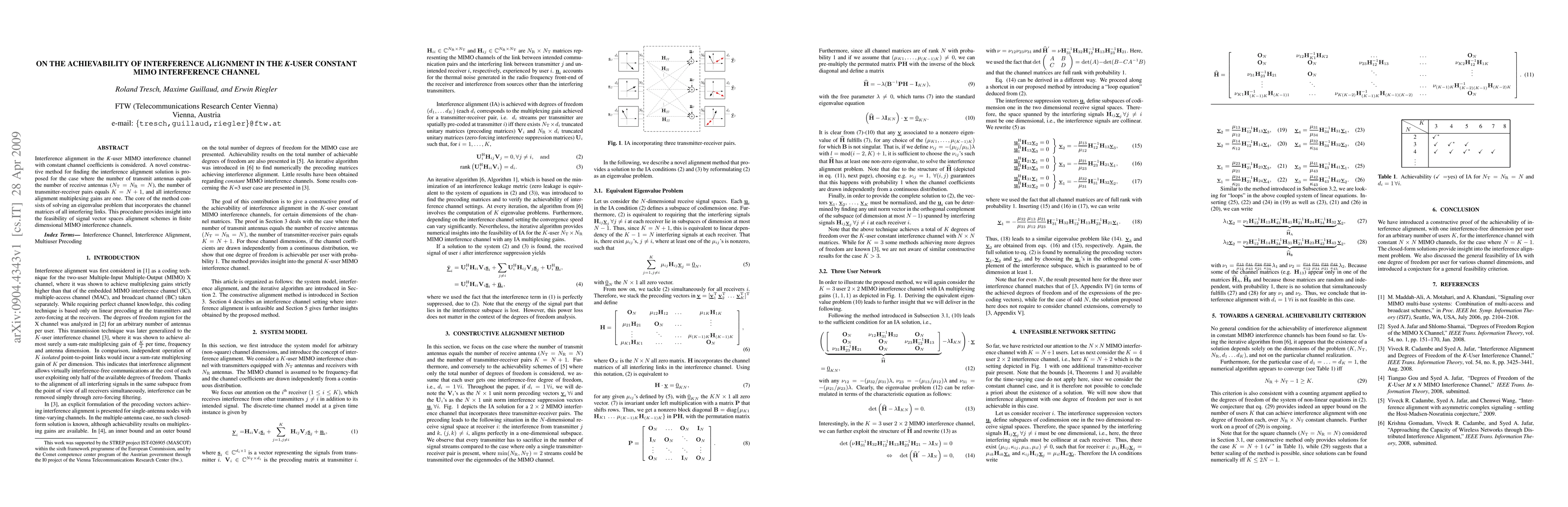 This paper proposes a novel constructive method for achieving interference alignment in a K-user MIMO channel with constant channel coefficients, where the number of transmit and receive antennas equals N and K equals N+1. The method involves solving an eigenvalue problem based on channel matrices, providing insights into the alignment of signal vector spaces in finite dimensional MIMO interference channels.