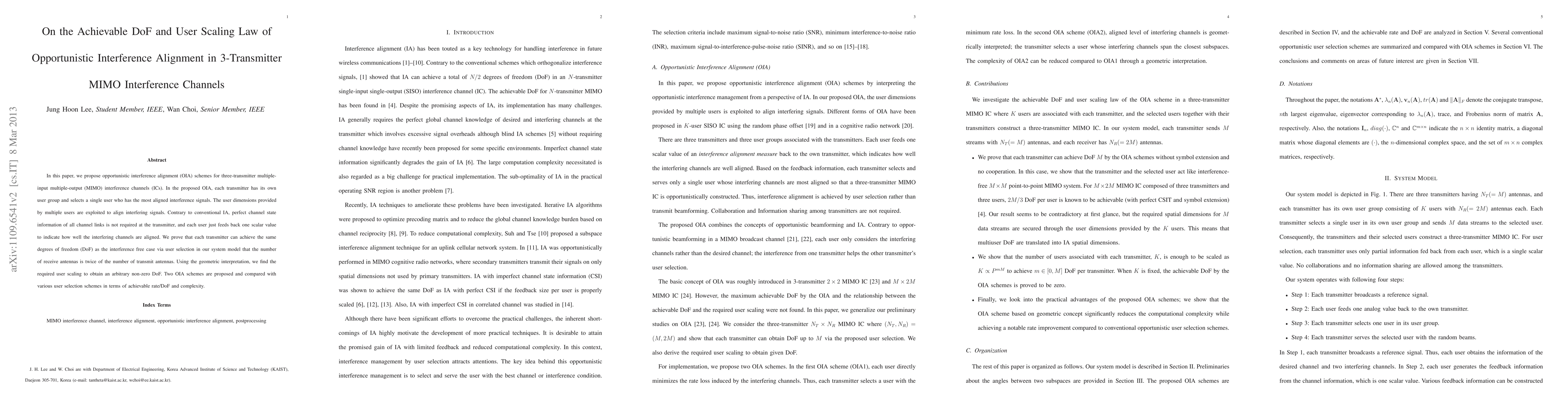 This paper proposes opportunistic interference alignment (OIA) schemes for 3-transmitter MIMO channels, where each transmitter selects a user for optimal interference alignment. The schemes achieve full degrees of freedom without requiring full channel state information, using user feedback. The study also determines the user scaling required for non-zero degrees of freedom.