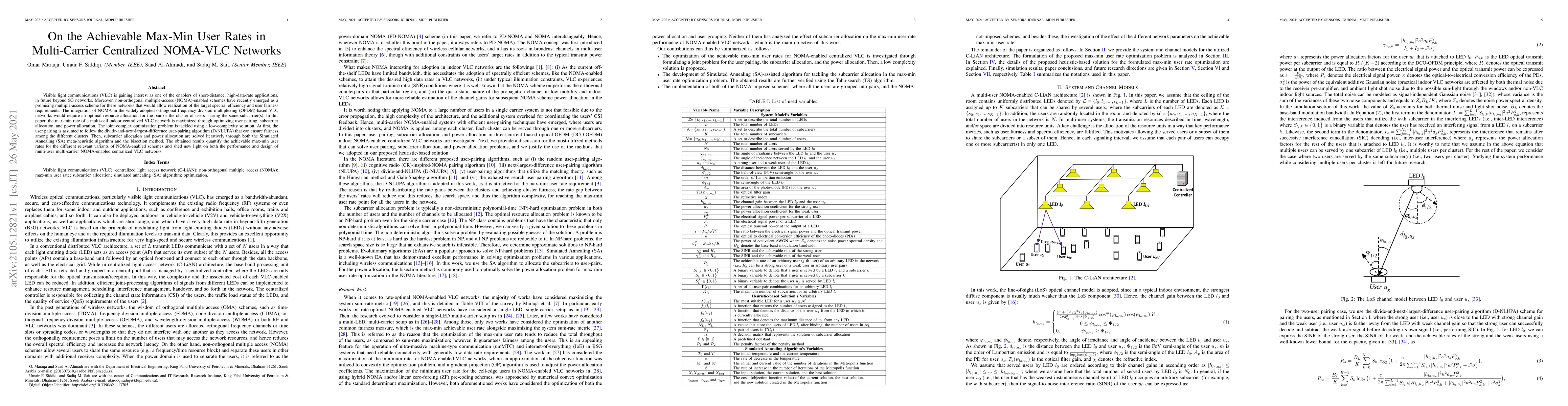 This paper investigates the optimization of max-min user rates in multi-carrier centralized NOMA-VLC networks, employing a low-complexity solution to maximize user pairing, subcarrier allocation, and power allocation. The study leverages the D-NLUPA algorithm for user pairing, and combines Simulated Annealing and the bisection method for subcarrier and power allocation optimization.