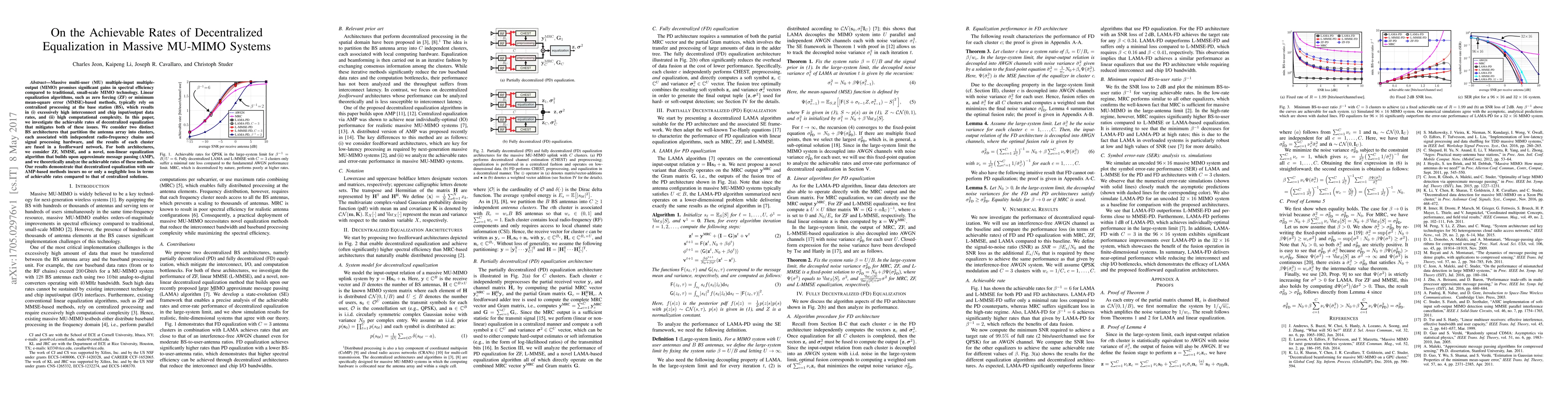 Massive multi-user (MU) multiple-input multiple-output (MIMO) promises significant gains in spectral efficiency compared to traditional, small-scale MIMO technology. Linear equalization algorithms, such as zero forcing (ZF) or minimum mean-square error (MMSE)-based methods, typically rely on centralized processing at the base station (BS), which results in (i) excessively high interconnect and chip input/output data rates, and (ii) high computational complexity. In this paper, we investigate the achievable rates of decentralized equalization that mitigates both of these issues. We consider two distinct BS architectures that partition the antenna array into clusters, each associated with independent radio-frequency chains and signal processing hardware, and the results of each cluster are fused in a feedforward network. For both architectures, we consider ZF, MMSE, and a novel, non-linear equalization algorithm that builds upon approximate message passing (AMP), and we theoretically analyze the achievable rates of these methods. Our results demonstrate that decentralized equalization with our AMP-based methods incurs no or only a negligible loss in terms of achievable rates compared to that of centralized solutions.