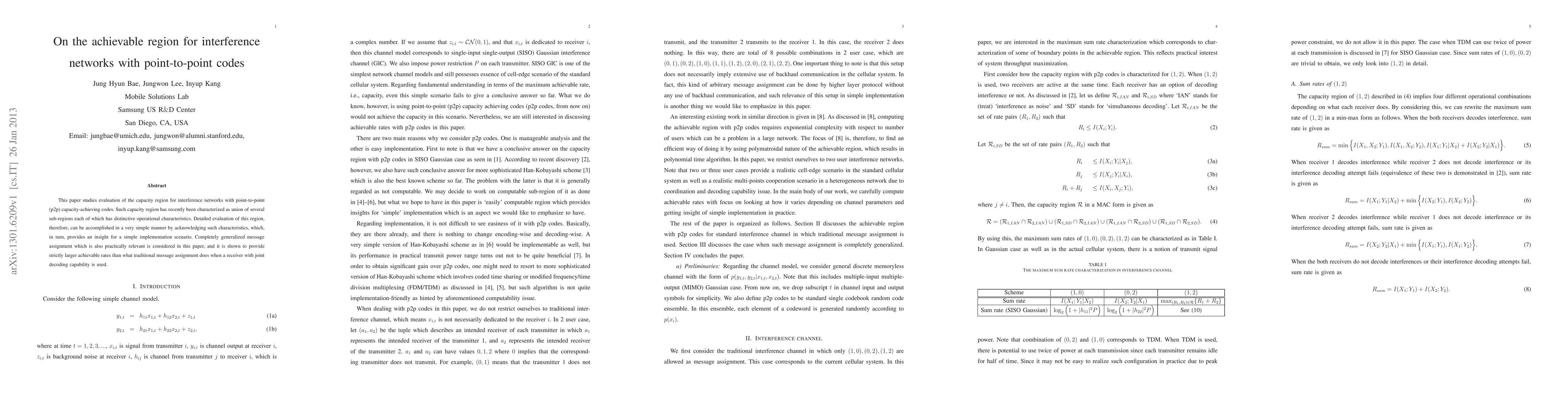 This paper studies evaluation of the capacity region for interference networks with point-to-point (p2p) capacity-achieving codes. Such capacity region has recently been characterized as union of several sub-regions each of which has distinctive operational characteristics. Detailed evaluation of this region, therefore, can be accomplished in a very simple manner by acknowledging such characteristics, which, in turn, provides an insight for a simple implementation scenario. Completely generalized message assignment which is also practically relevant is considered in this paper, and it is shown to provide strictly larger achievable rates than what traditional message assignment does when a receiver with joint decoding capability is used.
