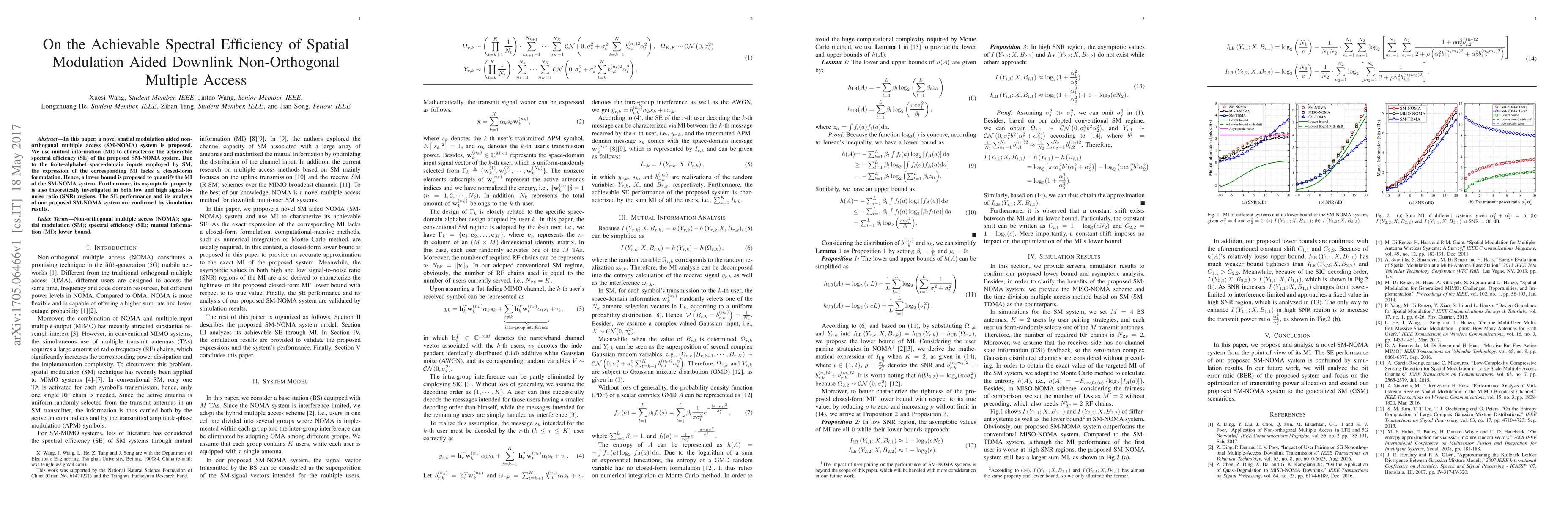 This paper proposes a novel spatial modulation aided non-orthogonal multiple access (SM-NOMA) system, using mutual information to characterize achievable spectral efficiency. A lower bound is developed for mutual information due to the lack of a closed-form expression, and its asymptotic properties are analyzed under varying SNR conditions.
