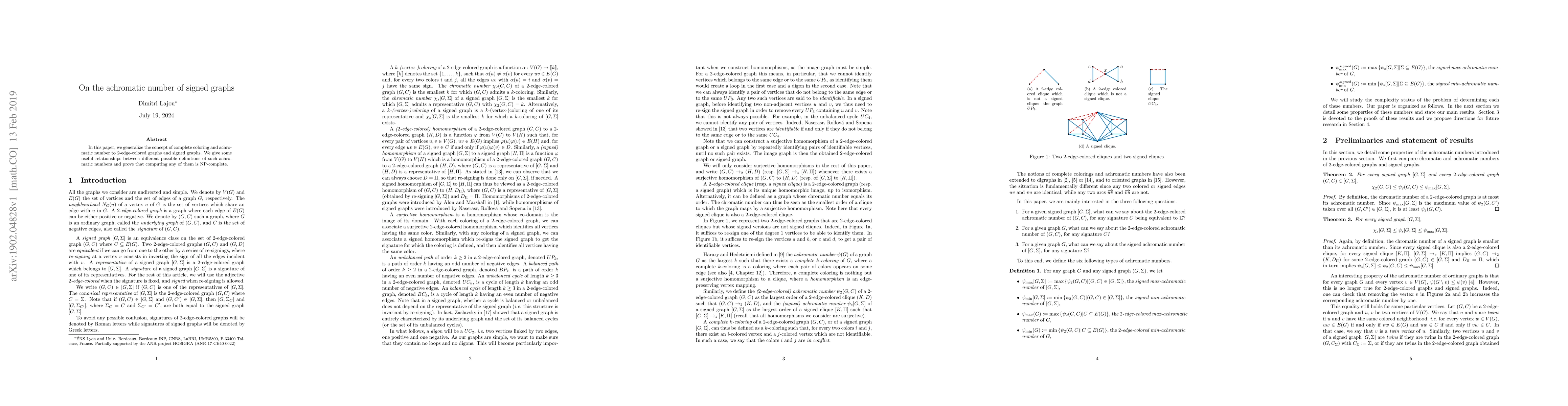 This paper extends the concepts of complete coloring and achromatic number to 2-edge-colored and signed graphs, establishing relationships between various definitions and proving the NP-completeness of computing any of these achromatic numbers.