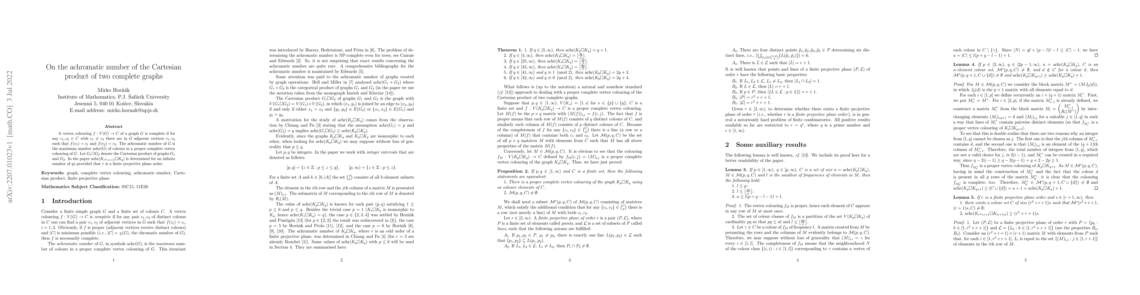 A vertex colouring $f:V(G)\to C$ of a graph $G$ is complete if for any $c_1,c_2\in C$ with $c_1\ne c_2$ there are in $G$ adjacent vertices $v_1,v_2$ such that $f(v_1)=c_1$ and $f(v_2)=c_2$. The achromatic number of $G$ is the maximum number $\mathrm{achr}(G)$ of colours in a proper complete vertex colouring of $G$. Let $G_1\square G_2$ denote the Cartesian product of graphs $G_1$ and $G_2$. In the paper $\mathrm{achr}(K_{r^2+r+1}\square K_q)$ is determined for an infinite number of $q$s provided that $r$ is a finite projective plane order.