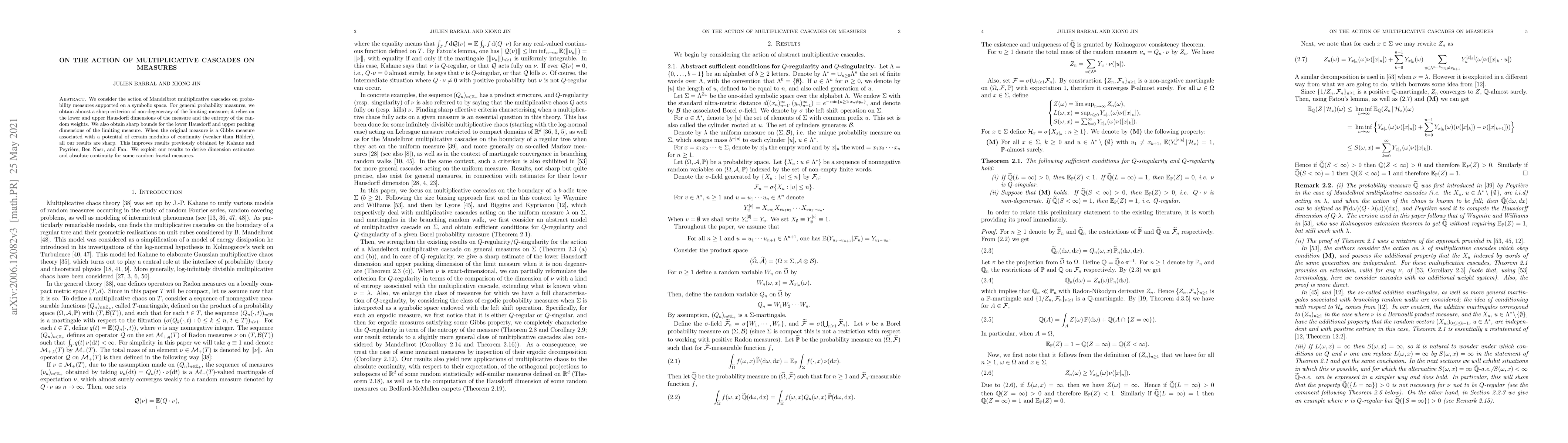 We consider the action of Mandelbrot multiplicative cascades on probability measures supported on a symbolic space. For general probability measures, we obtain almost a sharp criterion of non-degeneracy of the limiting measure; it relies on the lower and upper Hausdorff dimensions of the measure and the entropy of the random weights. We also obtain sharp bounds for the lower Hausdorff and upper packing dimensions of the limiting measure. When the original measure is a Gibbs measure associated with a potential of certain modulus of continuity (weaker than H\"older), all our results are sharp. This improves results previously obtained by Kahane and Peyri\`ere, Ben Nasr, and Fan. We exploit our results to derive dimension estimates and absolute continuity for some random fractal measures.