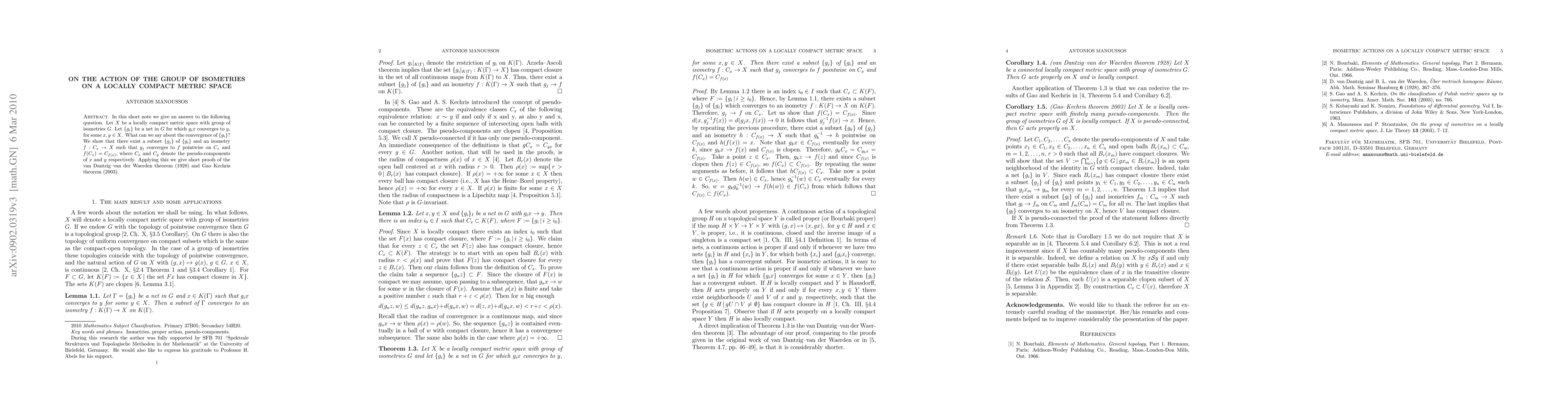 In this short note we give an answer to the following question. Let $X$ be a locally compact metric space with group of isometries $G$. Let $\{g_i\}$ be a net in $G$ for which $g_ix$ converges to $y$, for some $x,y\in X$. What can we say about the convergence of $\{g_i\}$? We show that there exist a subnet $\{g_j\}$ of $\{g_i\}$ and an isometry $f:C_x\to X$ such that $g_{j}$ converges to $f$ pointwise on $C_x$ and $f(C_x)=C_{f(x)}$, where $C_x$ and $C_y$ denote the pseudo-components of $x$ and $y$ respectively. Applying this we give short proofs of the van Dantzig--van der Waerden theorem (1928) and Gao--Kechris theorem (2003).