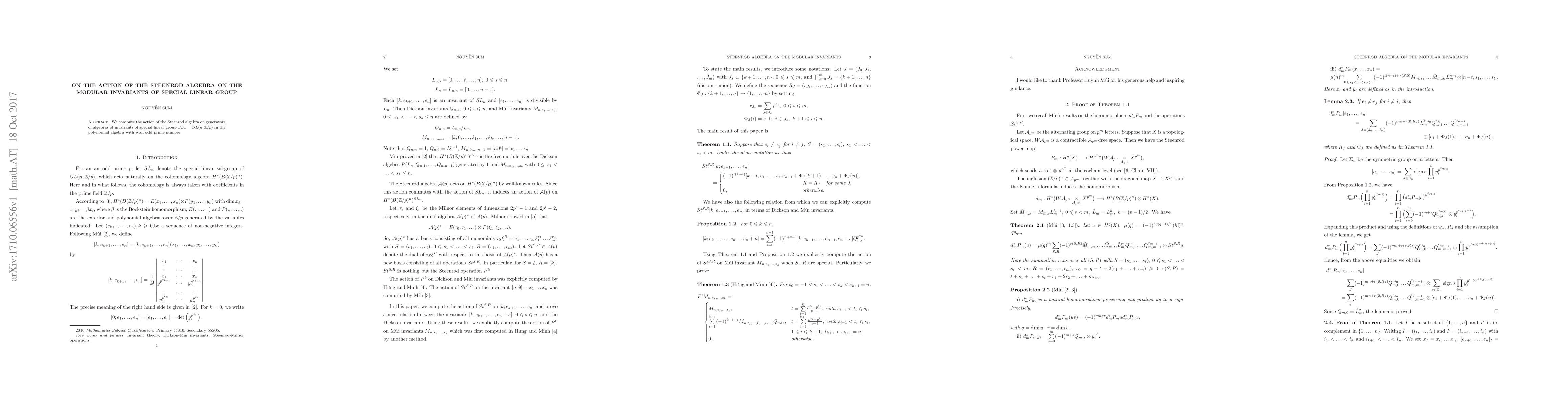 Summary: This paper computes the action of the Steenrod algebra on the generators of the algebra of modular invariants for the special linear group $SL_n$ over $\mathbb{Z}/p$, where $p$ is an odd prime. The results provide insights into the structure of these invariants under the Steenrod operations.