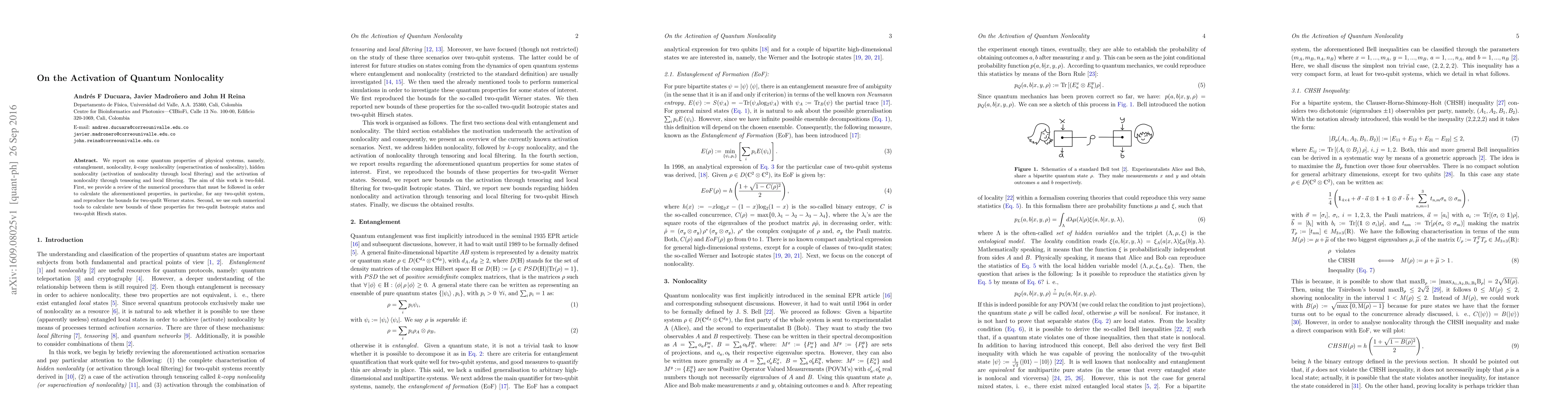 We report on some quantum properties of physical systems, namely, entanglement, nonlocality, $k$-copy nonlocality (superactivation of nonlocality), hidden nonlocality (activation of nonlocality through local filtering) and the activation of nonlocality through tensoring and local filtering. The aim of this work is two-fold. First, we provide a review of the numerical procedures that must be followed in order to calculate the aforementioned properties, in particular, for any two-qubit system, and reproduce the bounds for two-qudit Werner states. Second, we use such numerical tools to calculate new bounds of these properties for two-qudit Isotropic states and two-qubit Hirsch states.