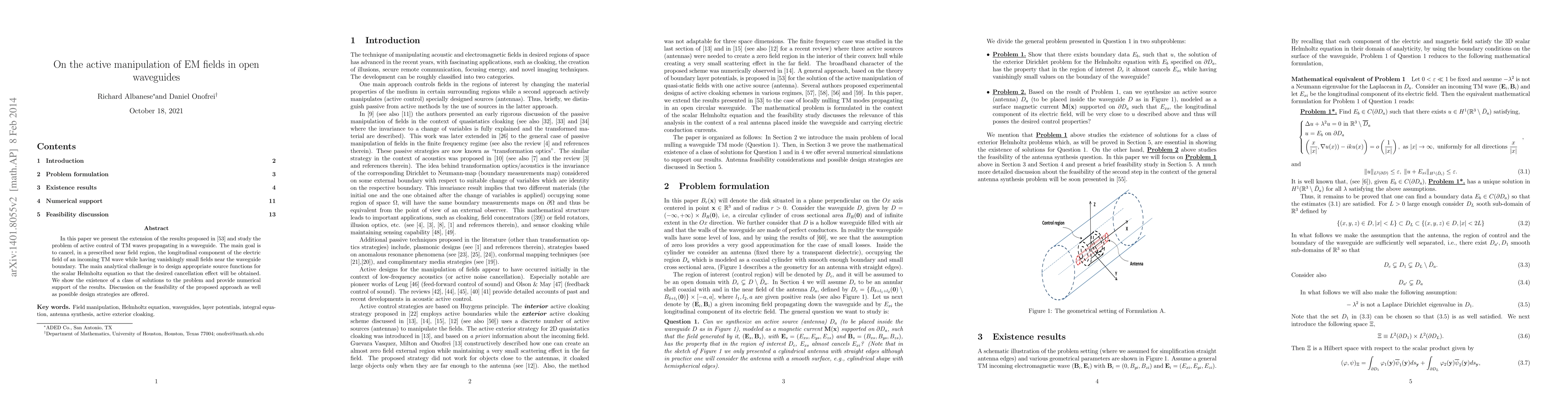 In this paper we present the extension of the results proposed in \cite{Onofrei-S} and study the problem of active control of TM waves propagating in a waveguide. The main goal is to cancel, in a prescribed near field region, the longitudinal component of the electric field of an incoming TM wave while having vanishingly small fields near the waveguide boundary. The main analytical challenge is to design appropriate source functions for the scalar Helmholtz equation so that the desired cancellation effect will be obtained. We show the existence of a class of solutions to the problem and provide numerical support of the results. Discussion on the feasibility of the proposed approach as well as possible design strategies are offered.