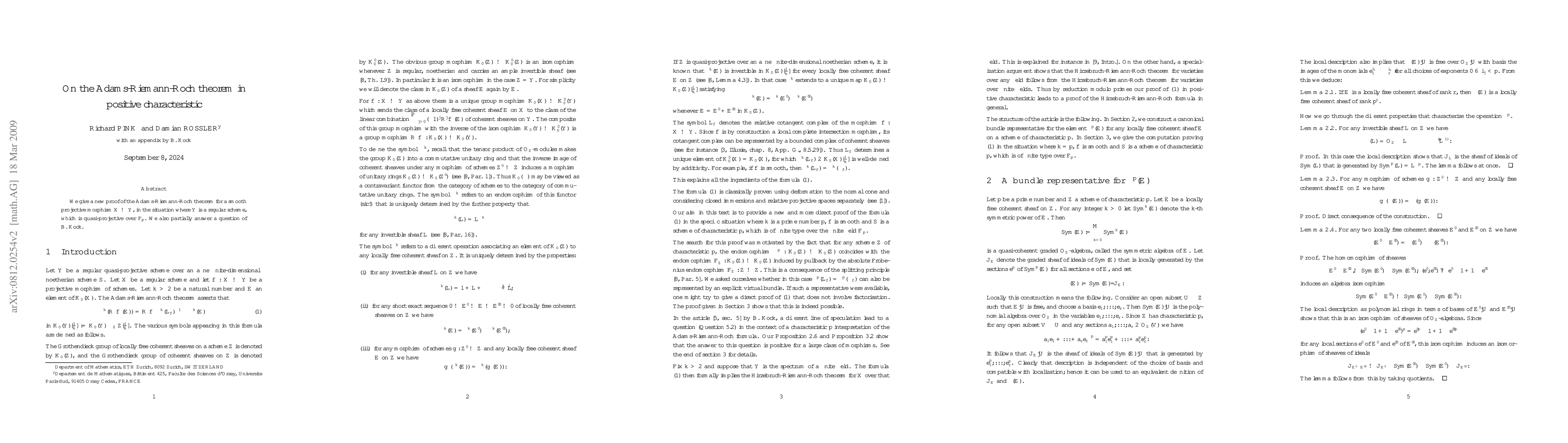 Summary: This paper presents a novel proof of the Adams-Riemann-Roch theorem for smooth projective morphisms over fields of positive characteristic, addressing a specific question posed by B. Köck. The focus is on regular quasi-projective schemes over $\mF_p$.