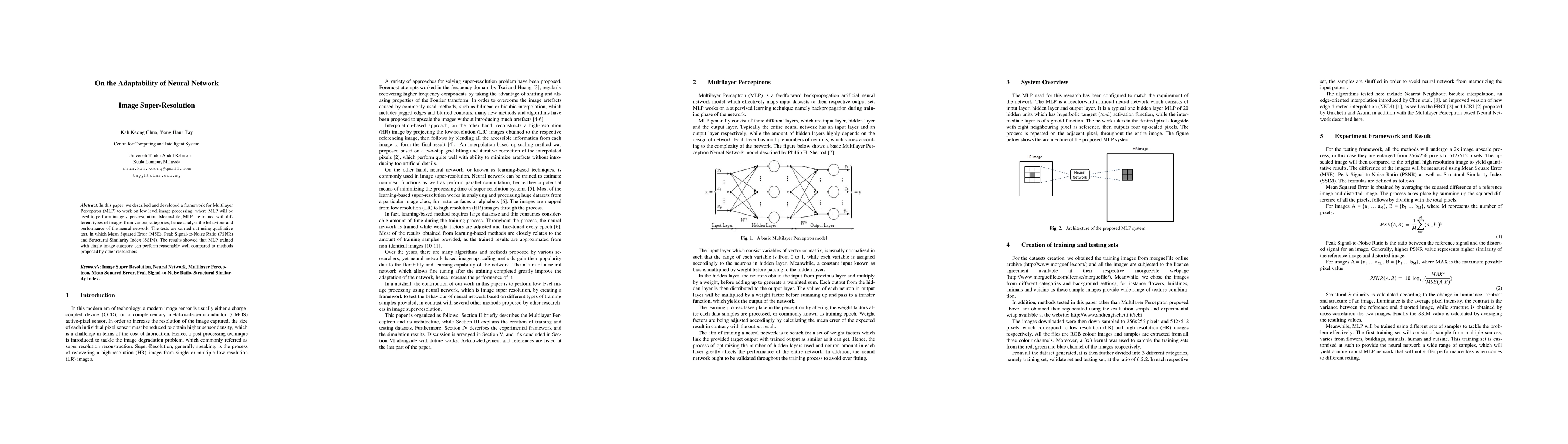 In this paper, we described and developed a framework for Multilayer Perceptron (MLP) to work on low level image processing, where MLP will be used to perform image super-resolution. Meanwhile, MLP are trained with different types of images from various categories, hence analyse the behaviour and performance of the neural network. The tests are carried out using qualitative test, in which Mean Squared Error (MSE), Peak Signal-to-Noise Ratio (PSNR) and Structural Similarity Index (SSIM). The results showed that MLP trained with single image category can perform reasonably well compared to methods proposed by other researchers.