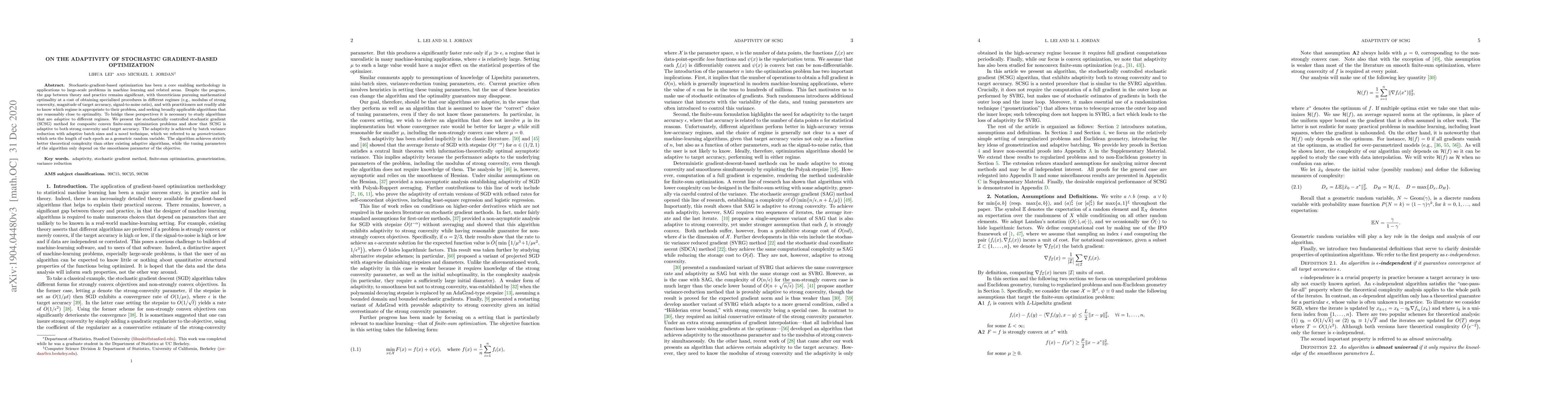 Stochastic-gradient-based optimization has been a core enabling methodology in applications to large-scale problems in machine learning and related areas. Despite the progress, the gap between theory and practice remains significant, with theoreticians pursuing mathematical optimality at a cost of obtaining specialized procedures in different regimes (e.g., modulus of strong convexity, magnitude of target accuracy, signal-to-noise ratio), and with practitioners not readily able to know which regime is appropriate to their problem, and seeking broadly applicable algorithms that are reasonably close to optimality. To bridge these perspectives it is necessary to study algorithms that are adaptive to different regimes. We present the stochastically controlled stochastic gradient (SCSG) method for composite convex finite-sum optimization problems and show that SCSG is adaptive to both strong convexity and target accuracy. The adaptivity is achieved by batch variance reduction with adaptive batch sizes and a novel technique, which we referred to as geometrization, which sets the length of each epoch as a geometric random variable. The algorithm achieves strictly better theoretical complexity than other existing adaptive algorithms, while the tuning parameters of the algorithm only depend on the smoothness parameter of the objective.