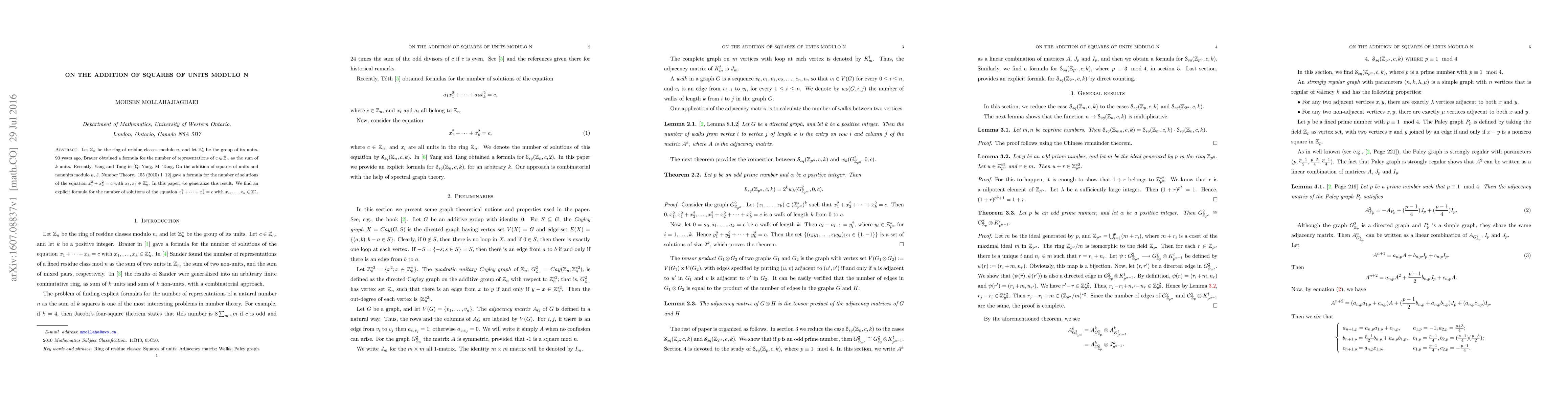 The paper finds an explicit formula for the number of solutions to the equation $x^2_{1}+ extit{...}+x^2_{k}=c$ with $x_{i} extit{in $ extit{Z}_n^{ extast}$}$, generalizing a previous result on squares of units modulo n.