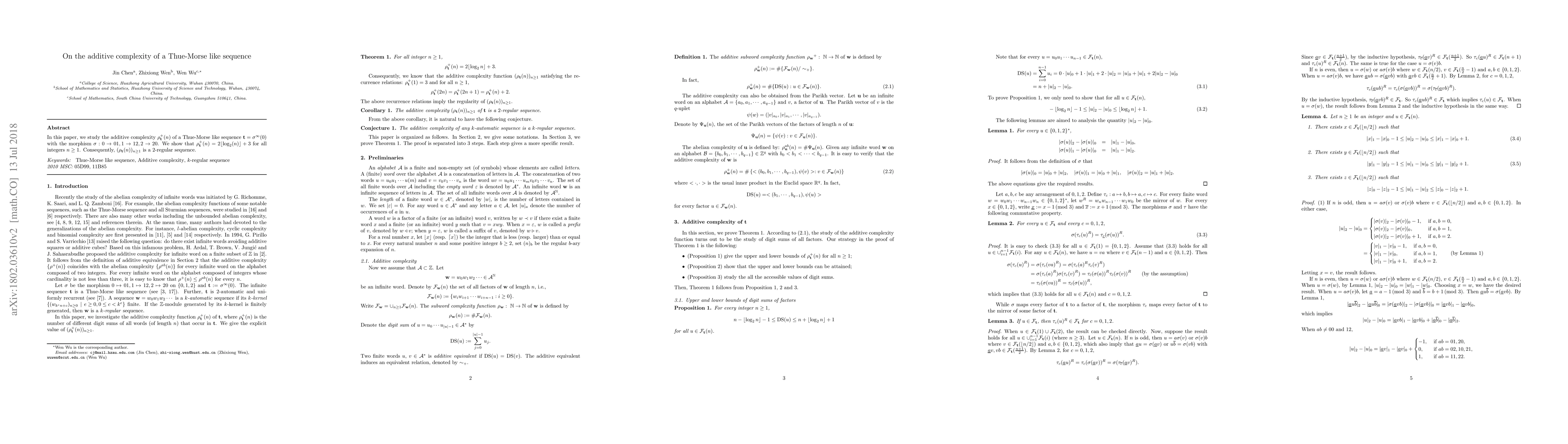 In this paper, we study the additive complexity $\rho^{+}_{\mathbf{t}}(n)$ of a Thue-Morse like sequence $\mathbf{t}=\sigma^{\infty}(0)$ with the morphism $\sigma: 0\to 01, 1\to 12, 2\to 20$. We show that $\rho^{+}_{\mathbf{t}}(n)=2\lfloor\log_2(n)\rfloor+3$ for all integers $n\geq 1$. Consequently, $(\rho_{\mathbf{t}}(n))_{n\geq 1}$ is a $2$-regular sequence.