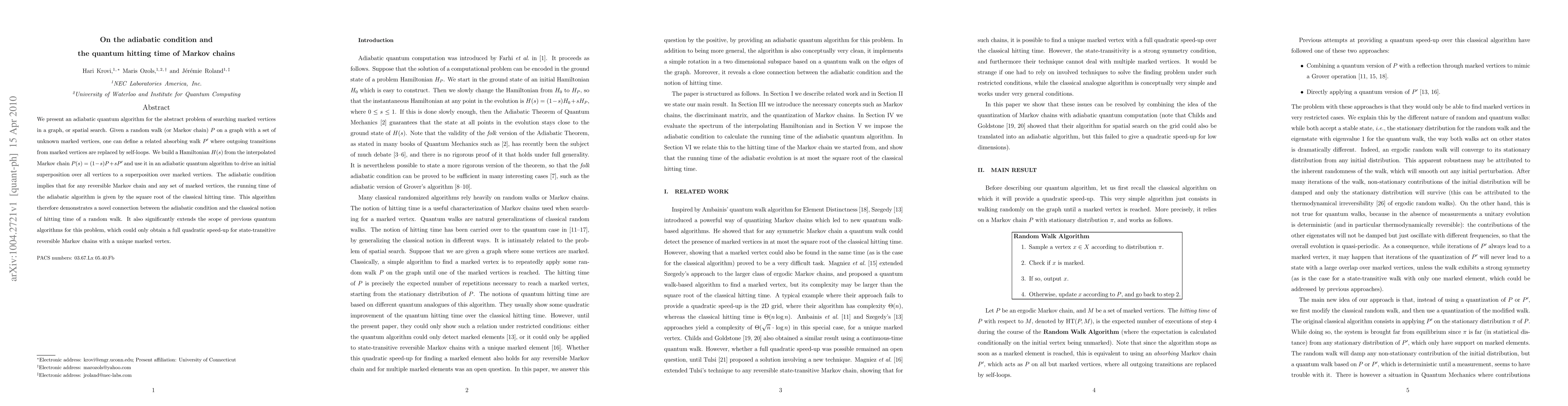 We present an adiabatic quantum algorithm for the abstract problem of searching marked vertices in a graph, or spatial search. Given a random walk (or Markov chain) $P$ on a graph with a set of unknown marked vertices, one can define a related absorbing walk $P'$ where outgoing transitions from marked vertices are replaced by self-loops. We build a Hamiltonian $H(s)$ from the interpolated Markov chain $P(s)=(1-s)P+sP'$ and use it in an adiabatic quantum algorithm to drive an initial superposition over all vertices to a superposition over marked vertices. The adiabatic condition implies that for any reversible Markov chain and any set of marked vertices, the running time of the adiabatic algorithm is given by the square root of the classical hitting time. This algorithm therefore demonstrates a novel connection between the adiabatic condition and the classical notion of hitting time of a random walk. It also significantly extends the scope of previous quantum algorithms for this problem, which could only obtain a full quadratic speed-up for state-transitive reversible Markov chains with a unique marked vertex.