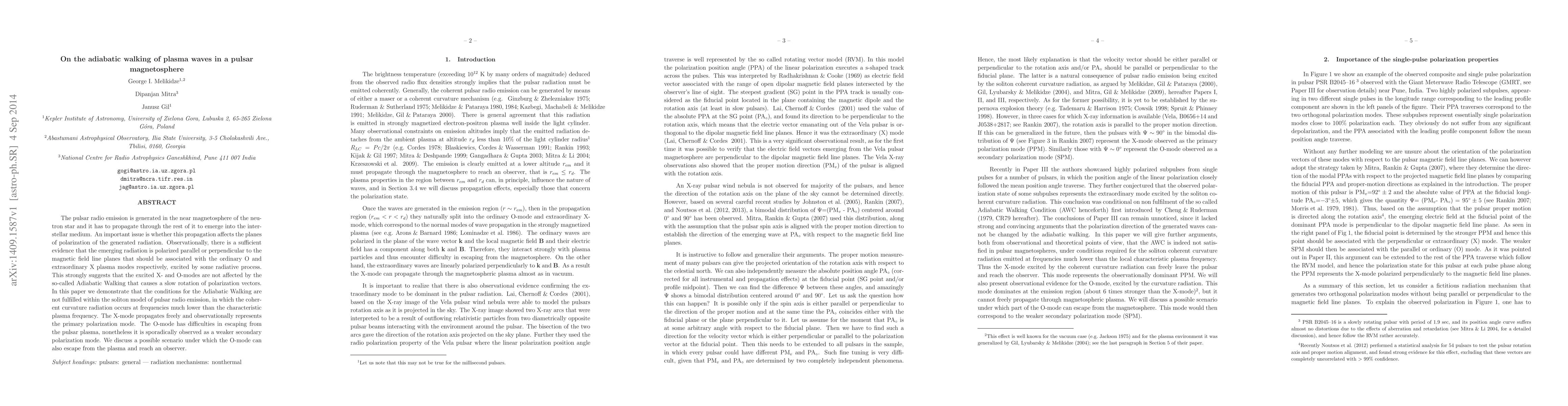 Research finds that plasma waves in a pulsar magnetosphere do not undergo Adiabatic Walking, a process affecting radiation polarization, due to the X-mode's free propagation and O-mode's limited escape from the plasma.
