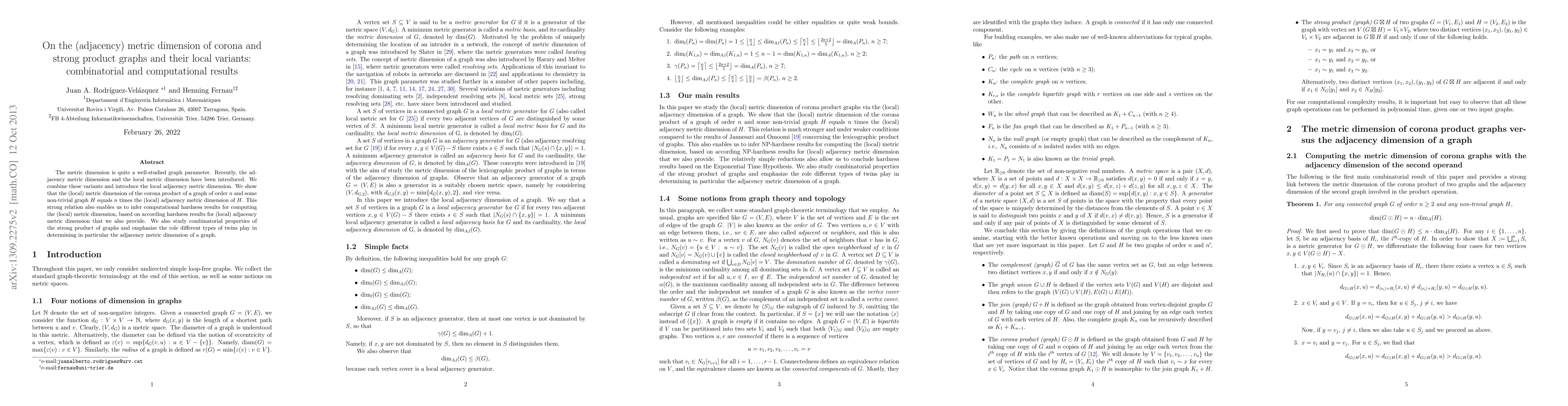 The metric dimension is quite a well-studied graph parameter. Recently, the adjacency metric dimension and the local metric dimension have been introduced. We combine these variants and introduce the local adjacency metric dimension. We show that the (local) metric dimension of the corona product of a graph of order $n$ and some non-trivial graph $H$ equals $n$ times the (local) adjacency metric dimension of $H$. This strong relation also enables us to infer computational hardness results for computing the (local) metric dimension, based on according hardness results for (local) adjacency metric dimension that we also provide. We also study combinatorial properties of the strong product of graphs and emphasize the role different types of twins play in determining in particular the adjacency metric dimension of a graph.