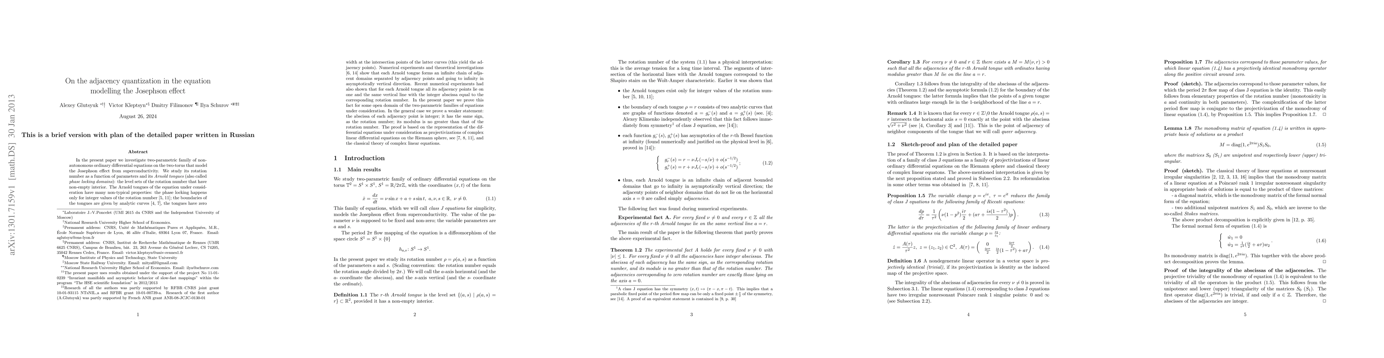 We investigate two-parametric family of non-autonomous ordinary differential equations on the two-torus $$\dot x=\frac{dx}{dt}=\nu\sin x + a + s \sin t, \ a,\nu,s\in\rr; \ \nu\neq0 \text {is fixed},$$ that model the Josephson effect from superconductivity. We study its rotation number as a function of parameters $(a,s)$ and its {\it Arnold tongues}: the level sets of the rotation number that have non-empty interior. Its Arnold tongues have many non-typical properties: they exist only for integer rotation numbers (V.M.Buchstaber, O.V.Karpov, S.I.Tertychnyi (2010); Yu.S.Ilyashenko, D.A.Ryzhov, D.A.Filimonov (2011)); their boundaries are given by pairs of analytic curves (V.M.Buchstaber, O.V.Karpov, S.I.Tertychnyi (2004, 2012)). Numerical experiments and theoretical investigations (V.M.Buchstaber, O.V.Karpov, S.I.Tertychnyi (2006); A.V.Klimenko and O.L.Romaskevich (2012)) show that each Arnold tongue forms an infinite chain of adjacent domains separated by adjacency points and going to infinity in asymptotically vertical direction. Recent numerical experiments had also shown that the adjacencies of each Arnold tongue have one and the same integer abscissa $a$ equal to the corresponding rotation number. We prove this fact for every fixed $\nu$ with $|\nu|\leq1$. In the general case we prove a weaker statement: the abscissa of each adjacency point is integer; it has the same sign, as the rotation number; its modulus is no greater than that of the rotation number. The proof is based on the representation of the differential equations under consideration as projectivizations of complex linear differential equations on the Riemann sphere (V.M.Buchstaber, O.V.Karpov, S.I.Tertychnyi (2004); R.L.Foote (1998); Yu.S.Ilyashenko, D.A.Ryzhov, D.A.Filimonov (2011)), and the classical theory of complex linear equations.