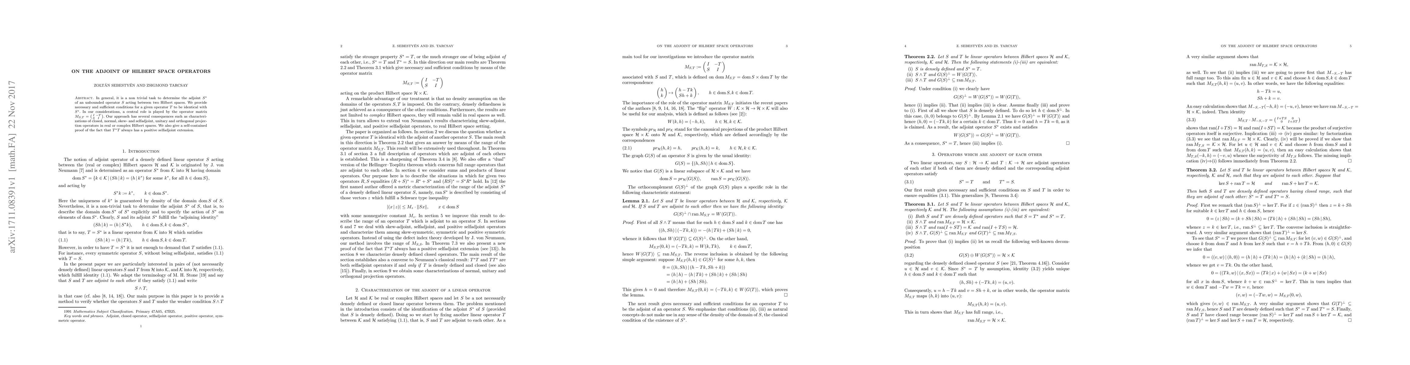 In general, it is a non trivial task to determine the adjoint $S^*$ of an unbounded operator $S$ acting between two Hilbert spaces. We provide necessary and sufficient conditions for a given operator $T$ to be identical with $S^*$. In our considerations, a central role is played by the operator matrix $M_{S,T}=\left(\begin{array}{cc} I & -T\\ S & I\end{array}\right)$. Our approach has several consequences such as characterizations of closed, normal, skew- and selfadjoint, unitary and orthogonal projection operators in real or complex Hilbert spaces. We also give a self-contained proof of the fact that $T^*T$ always has a positive selfadjoint extension.