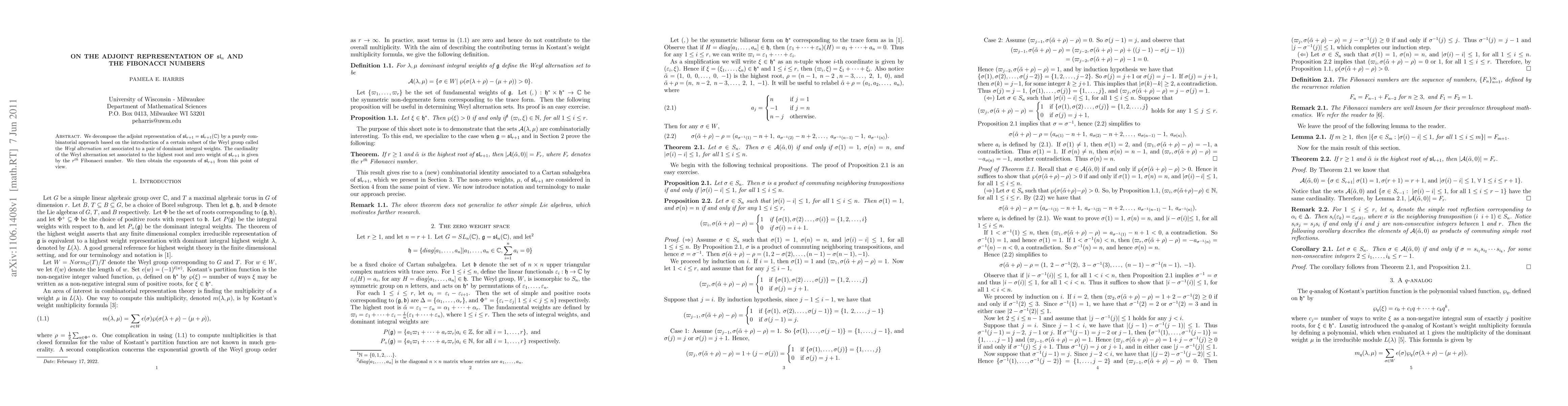 The paper decomposes the adjoint representation of $\mathfrak{sl}_{r+1}$ using a combinatorial approach linked to the Weyl alternation set, revealing that its cardinality corresponds to the $r^{th}$ Fibonacci number. This connection also aids in determining the exponents of $\mathfrak{sl}_{r+1}$.