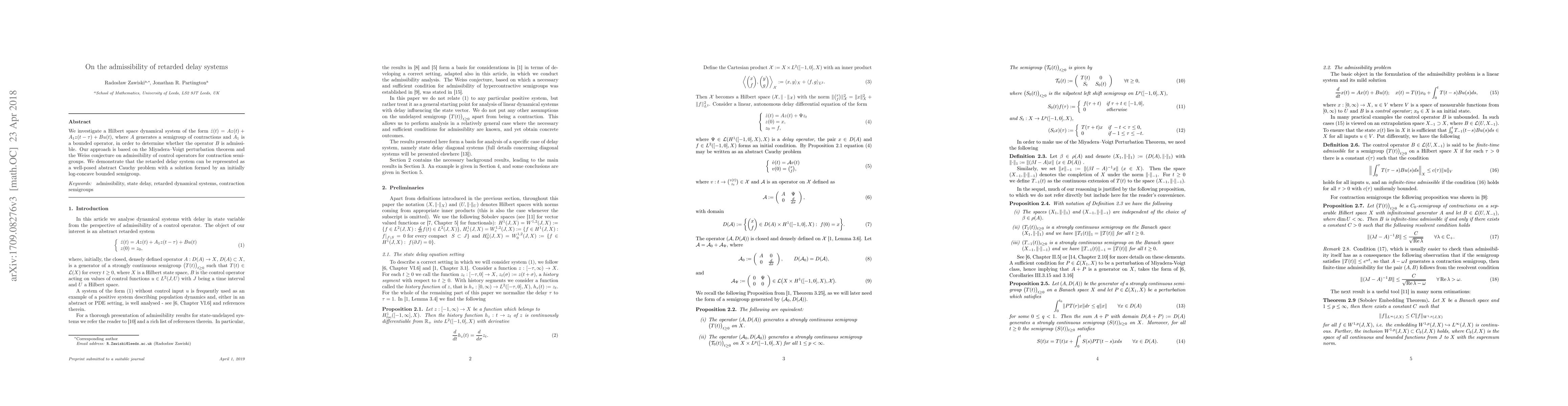 We investigate a Hilbert space dynamical system of the form $\dot{z}(t)=Az(t)+A_1z(t-\tau)+Bu(t)$, where $A$ generates a semigroup of contractions and $A_1$ is a bounded operator, in order to determine whether the operator $B$ is admissible. Our approach is based on the Miyadera--Voigt perturbation theorem and the Weiss conjecture on admissibility of control operators for contraction semigroups. We demonstrate that the retarded delay system can be represented as a well-posed abstract Cauchy problem with a solution formed by an initially log-concave bounded semigroup.
