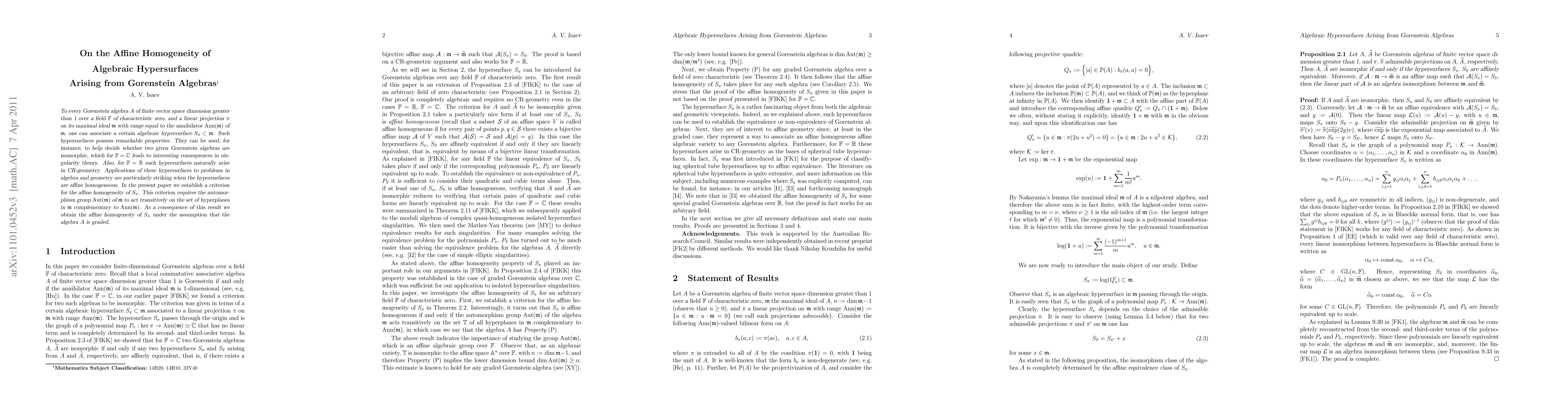To every Gorenstein algebra $A$ of finite dimension greater than 1 over a field ${\Bbb F}$ of characteristic zero, and a projection $\pi$ on its maximal ideal ${\mathfrak m}$ with range equal to the annihilator $\hbox{Ann}({\mathfrak m})$ of ${\mathfrak m}$, one can associate a certain algebraic hypersurface $S_{\pi}\subset{\mathfrak m}$. Such hypersurfaces possess remarkable properties. They can be used, for instance, to help decide whether two given Gorenstein algebras are isomorphic, which for ${\Bbb F}={\Bbb C}$ leads to interesting consequences in singularity theory. Also, for ${\Bbb F}={\Bbb R}$ such hypersurfaces naturally arise in CR-geometry. Applications of these hypersurfaces to problems in algebra and geometry are particularly striking when the hypersurfaces are affine homogeneous. In the present paper we establish a criterion for the affine homogeneity of $S_{\pi}$. This condition requires the automorphism group $\hbox{Aut}({\mathfrak m})$ of ${\mathfrak m}$ to act transitively on the set of hyperplanes in ${\mathfrak m}$ complementary to $\hbox{Ann}({\mathfrak m})$. As a consequence of this result we obtain the affine homogeneity of $S_{\pi}$ under the assumption that the algebra $A$ is graded.